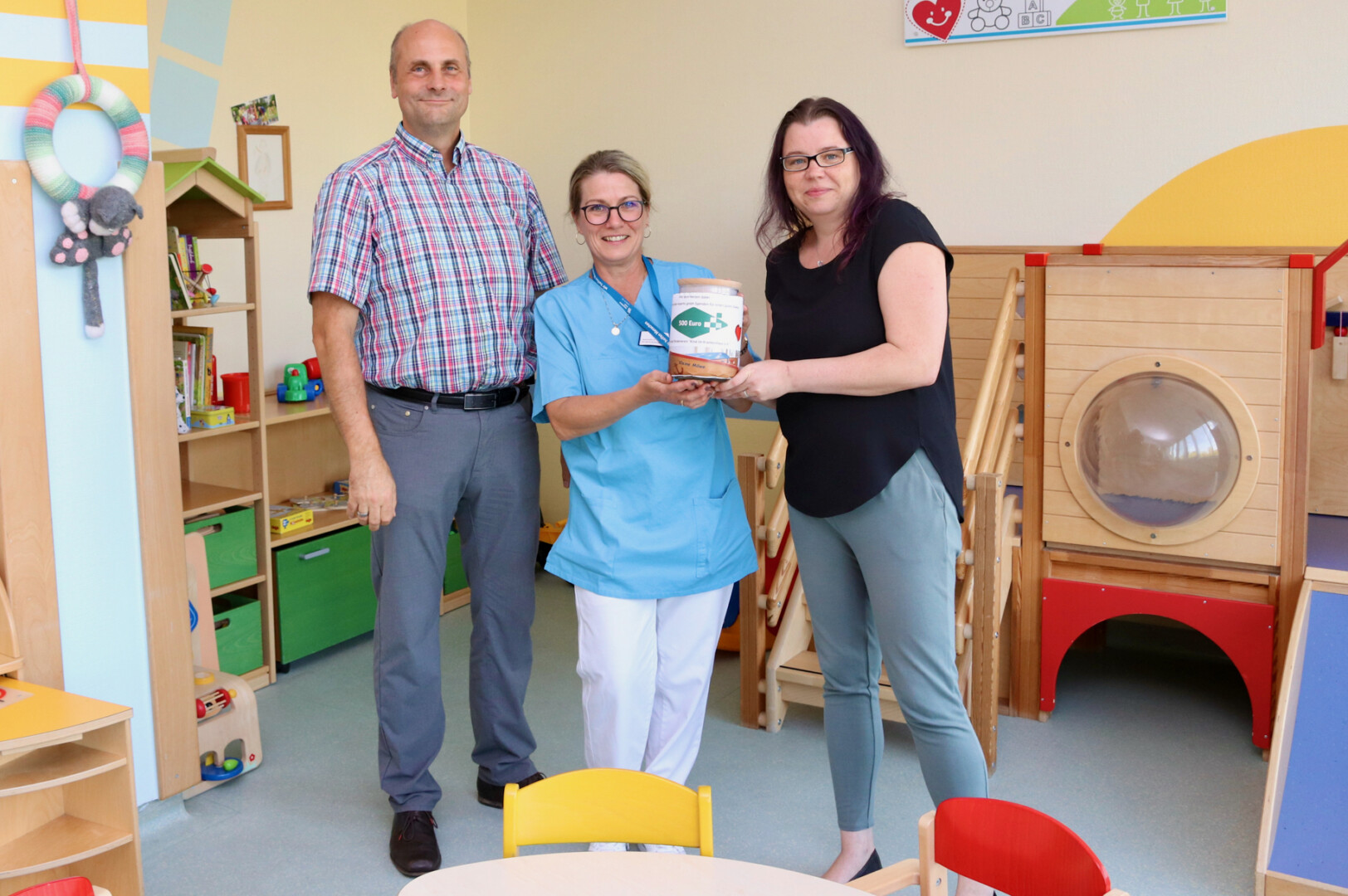 Die Vereinsvorsitzende Jeannette Mundthal beantwortete viele Fragen zum Krankenhaus und zur Arbeit des Vereins, als der Geschäftsführer und die Mitarbeiterin das Geld überbrachten. Eine kinder-, jugend- und familienfreundliche Klinik ist der Arbeitsschwerpunkt des Fördervereins. Der Verein engagiert sich unter anderem für die Ausstattung mit Spielzeug, kauft kleine Geschenke als Trost oder für Feste, unterstützt den Einsatz der Klinik-Clowns und finanziert Familien mit chronisch oder schwer kranken Kindern kleine Reisen als Auszeit. Die Vereinsvorsitzende gab dem Firmenchef ein großes Dankeschön für seine Belegschaft mit auf den Weg.