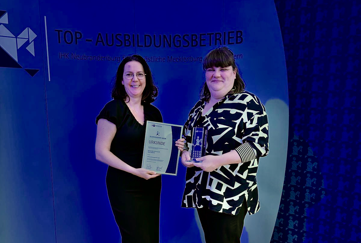 Immer mehr Unternehmen aus der Mecklenburgischen Seenplatte und Vorpommern-Greifswald bilden in sehr hoher Qualität in den IHK- Ausbildungsberufen aus. Dieses Jahr sind es erstmals 70 Firmen mit dem Titel „TOP-Ausbildungsbetrieb 2024“ geehrt worden – darunter 14 aus der Müritz-Region. Das Hotel und Restaurant „Kleines Meer“ in Waren bildet schon seit 26 Jahren aus und hat den Titel „TOP-Ausbildungsbetrieb“ gestern schon zum vierten Mal erhalten. Geschäftsführerin Kati Beier und Rezeptionsleiterin Franziska Ossig nahmen die Auszeichnung freudig entgegen (Foto).