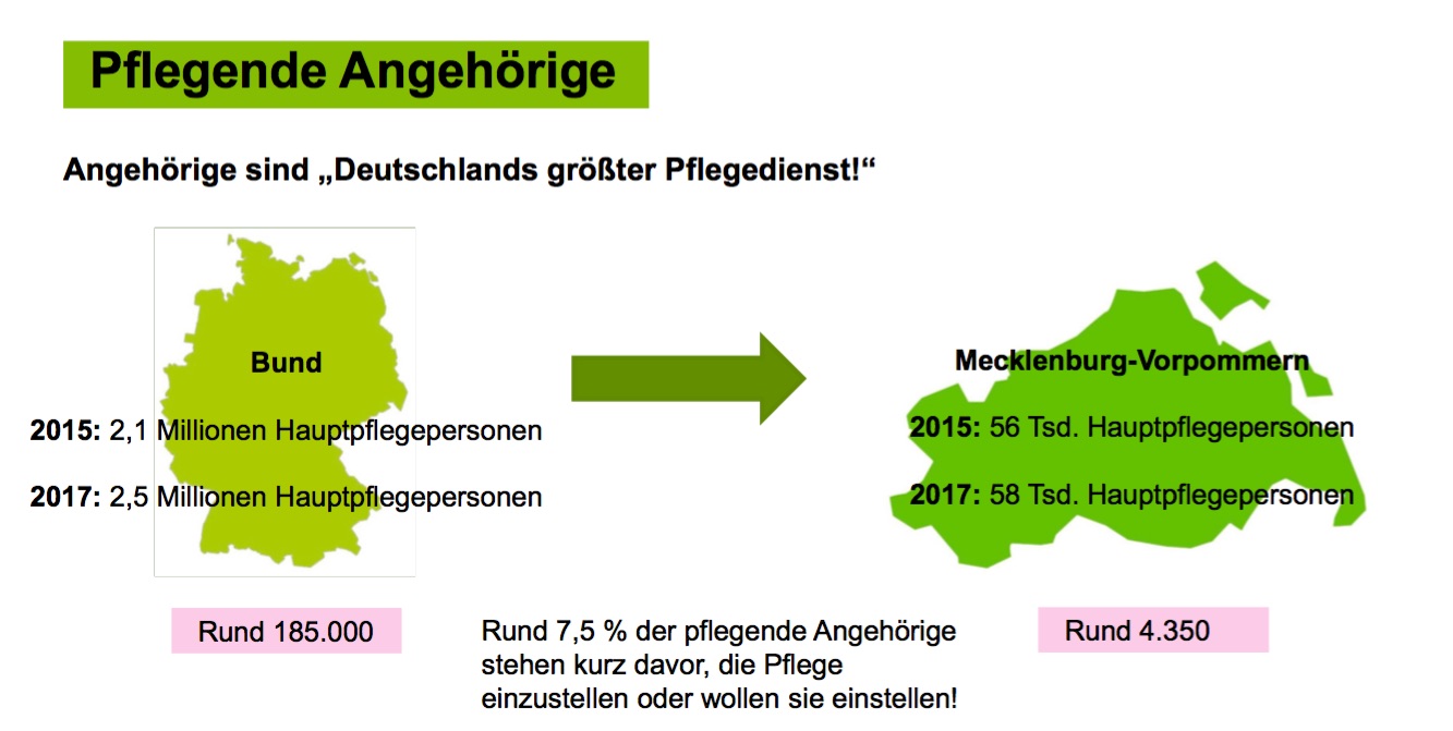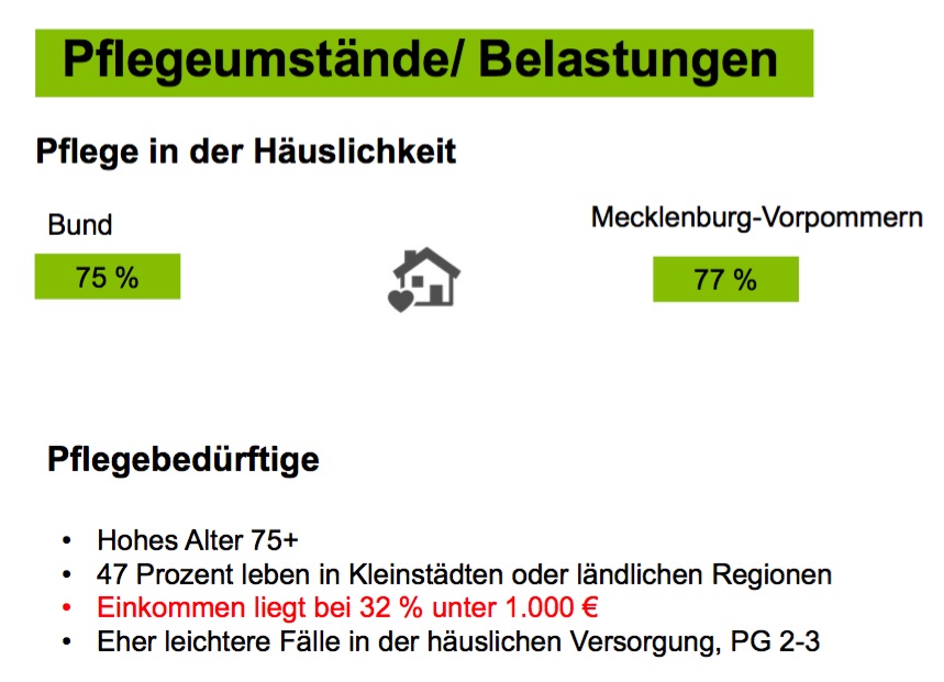 Die Zahlen belegen, dass pflegende Angehörige vergleichsweise häufiger krank sind als andere. So leiden in Mecklenburg-Vorpommern mehr als die Hälfte (59 Prozent) von ihnen unter Rückenbeschwerden. Nur in Brandenburg und Thüringen (60 Prozent) ist dieser Wert noch höher. Bei Personen, die niemanden pflegen, trifft dies auf 53 Prozent zu. Ähnlich verhält es sich bei Depressionen: Während der Anteil der Erkrankten unter den pflegenden Angehörigen in Mecklenburg-Vorpommern bei rund 22 Prozent liegt, sind es bei Personen, die niemanden pflegen, nur 17 Prozent. Insgesamt leidet in Deutschland jeder zweite pflegende Angehörige unter einer psychischen Störung. Die Unterstützungsangebote wie Kurzzeit- und Verhinderungspflege oder Haushaltshilfen werden von den pflegenden Angehörigen zwar überwiegend positiv bewertet, allerdings sehr wenig genutzt. Viele Pflegende wissen nicht, wo sie Hilfe erhalten können.