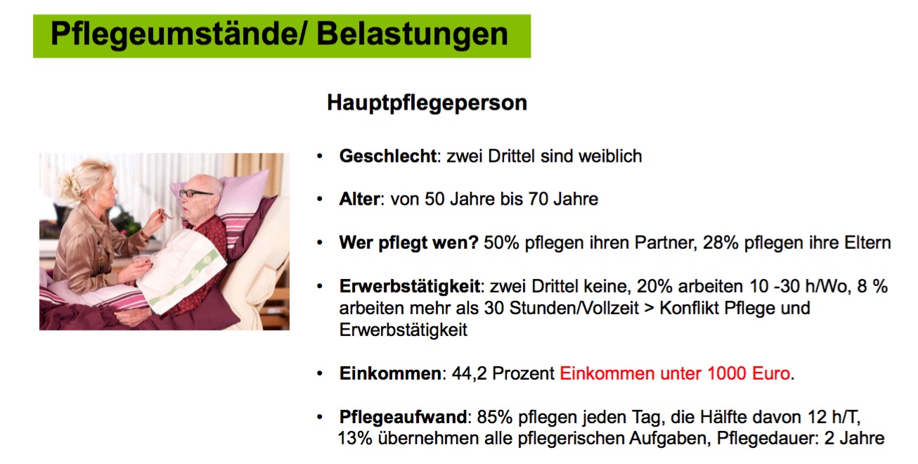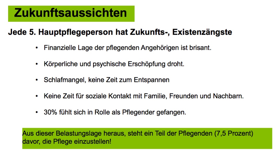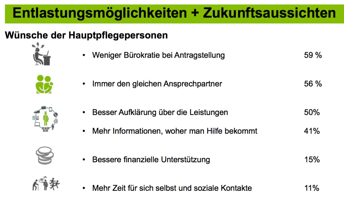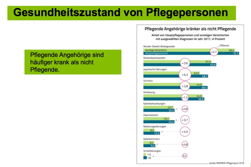 Doch der bürokratische Aufwand ist nur eine Form der Belastung: Bei 85 Prozent der Betroffenen bestimmt die Pflege täglich das Leben, fast 40 Prozent fehlt Schlaf, 30 Prozent fühlen sich in ihrer Rolle als Pflegende gefangen. In zwei Drittel aller Fälle übernehmen Frauen die Arbeit, in einem Drittel Männer. 38 Prozent der Hauptpflegepersonen sind 70 Jahre und älter. „Die pflegenden Familienmitglieder sind ein sehr wichtiger Pfeiler unseres Pflegesystems. Ohne ihren unschätzbaren Dienst würde das System zusammenbrechen. Oft kommen dabei jedoch ihre eigenen Bedürfnisse zu kurz und sie werden krank. Unsere Aufgabe muss es sein, die Rahmenbedingungen für pflegende Angehörige zu verbessern“, so der BARMER-Landeschef.