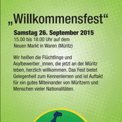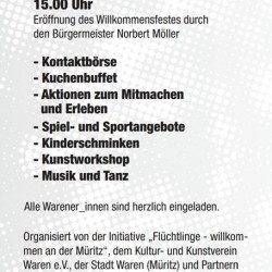 Bei der Vorbereitung und Organisation des Willkommensfestes haben viele Bürger der Stadt Waren in Kooperation mit der ehrenamtlichen Initiative „Flüchtlinge – Willkommen an der Müritz“ und dem Kultur- und Kunstverein Waren e.V. mitgewirkt. Gefördert wird das Fest aus Mitteln des Bundesprogramms „Demokratie leben!“