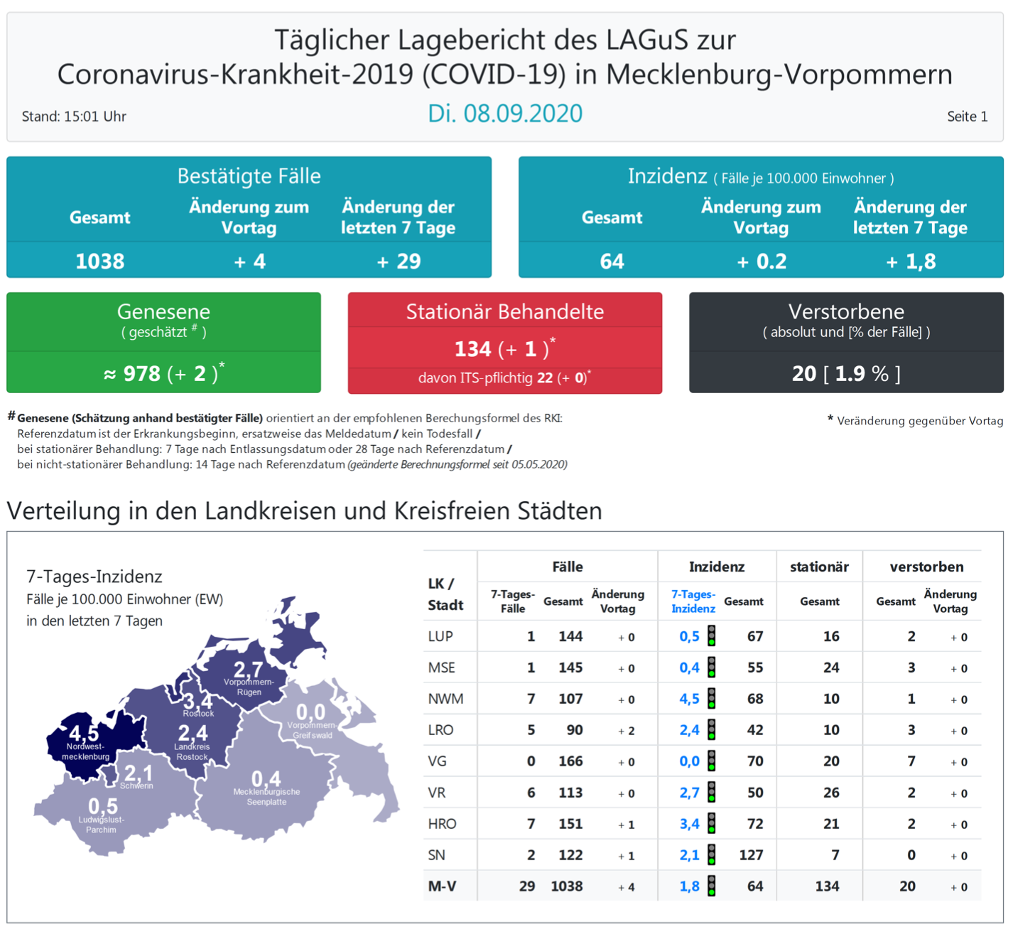 Landesweit müssen oder mussten den Angaben zufolge 134 (+1) Menschen in Kliniken behandelt werden, 22 (+0) von ihnen auf Intensivstationen.