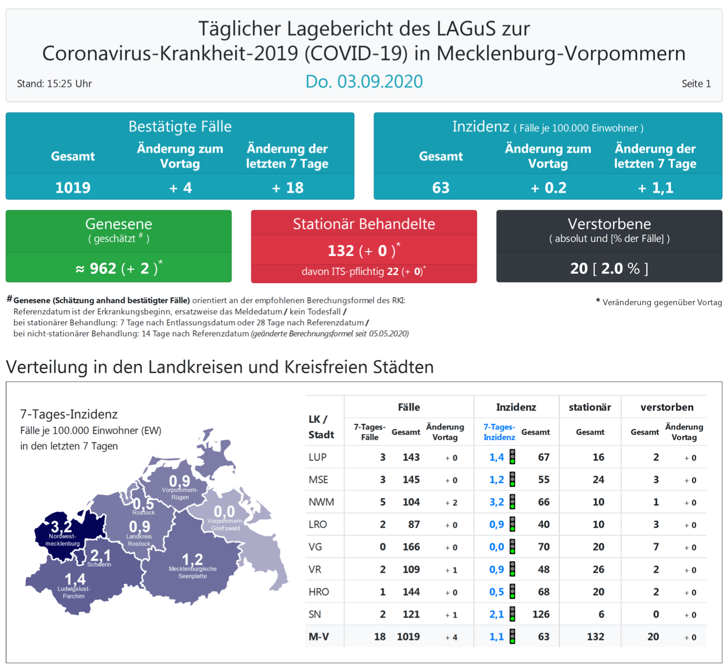 Landesweit müssen oder mussten den Angaben zufolge 132 (+0) Menschen in Kliniken behandelt werden, 22 (+0) von ihnen auf Intensivstationen.