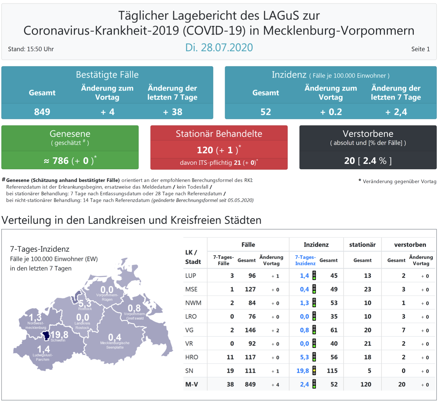 In Mecklenburg-Vorpommern sind bis heute 16 Uhr vier neue Corona-Neuinfektionen gemeldet worden. Insgesamt wurden in MV damit bisher 849 Infektionen festgestellt.