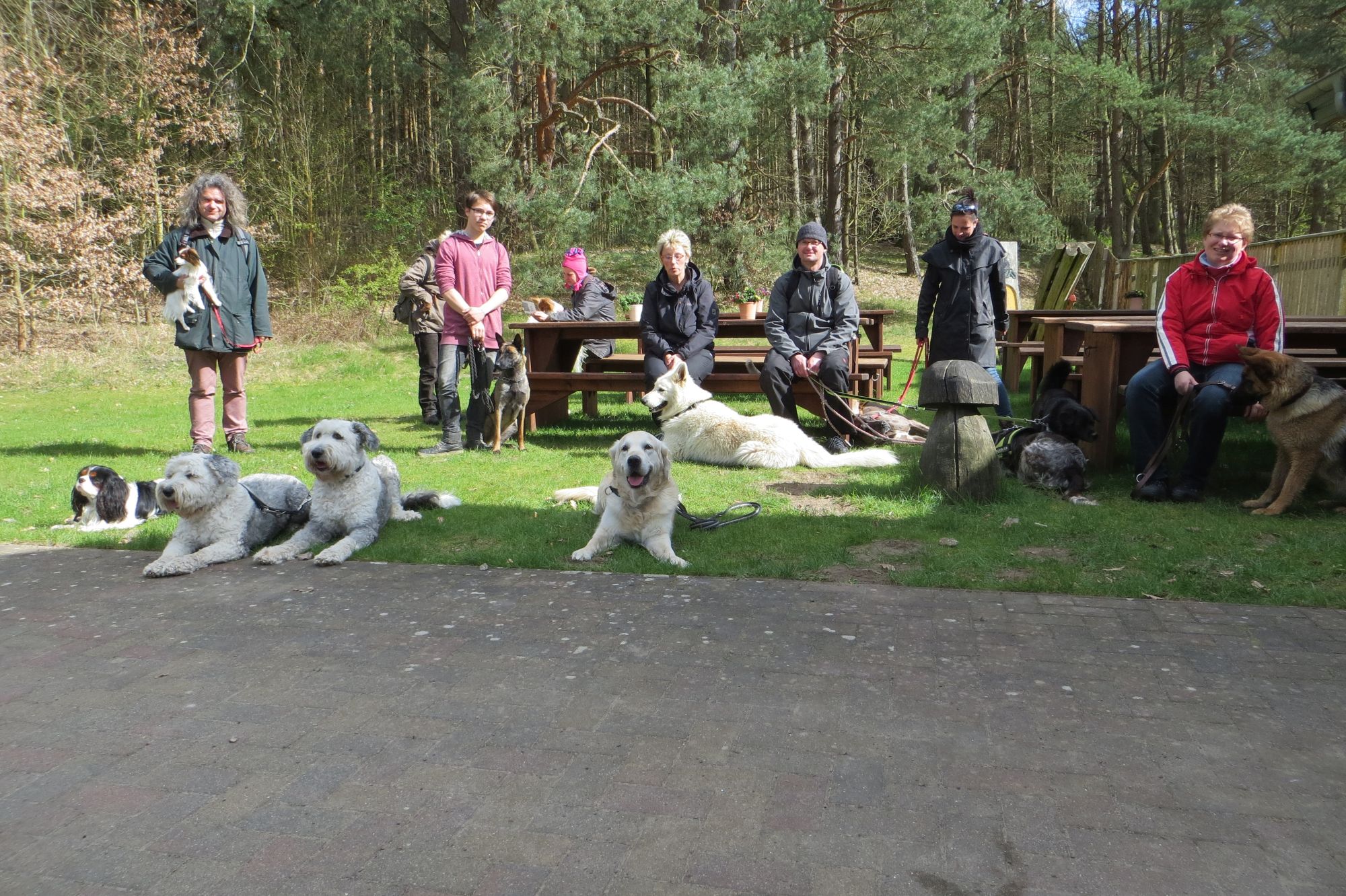 Zum ersten spielte das Wetter hervorragend mit. Sonnenschein und Wolken begleiteten die Wanderer, und von den Regenschauern, die in der Umgebung niedergingen, bekamen sie nichts ab. Zum zweiten hatten alle Zwei- und Vierbeiner Spaß an der Bewegung und an den eingestreuten Übungen, und die Hunde nutzten die Gelegenheiten zum gemeinsamen Toben.