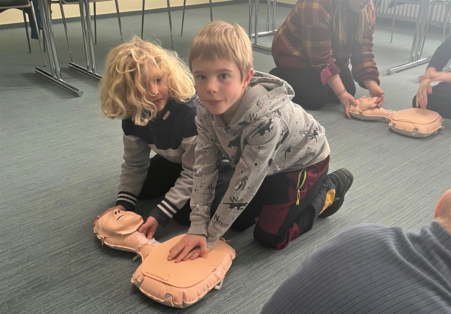 Wie wichtig die Einschätzung von Personen in Not ist und was zu tun ist, wenn eine Person nicht ansprechbar ist, das erklärten die Organisatorinnen des Projekttags, Jeannette Romer (Leiterin der Praxisanleiter), Antje Zädow (Hygienefachkraft) und Sarah Läser (Pflegefachfrau der Chirurgie und Praxisanleiterin). „Prüfen, Rufen, Drücken“ ist das Motto. „Zuerst sollte man prüfen, ob die Person noch reagiert und atmet. Dann muss der Rettungsdienst gerufen werden. Bis der Rettungsdienst da ist, sollte man mit der Reanimation starten“, sagteJeanette Romer. Wie das genau funktioniert, probierten die Kinder an speziellen Reanimationspuppen dann selbst aus.