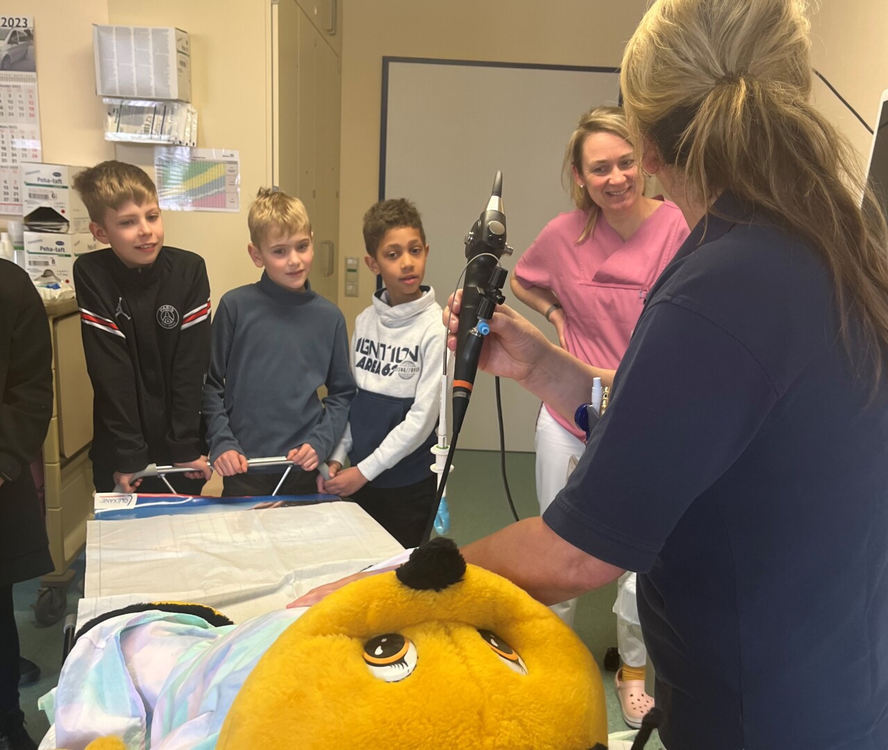 In der Fachabteilung für Urologie wartete die Stoffpuppe „Biene“ bereits darauf, mit einem Gastroskop behandelt zu werden. Alle schauten gespannt auf den Bildschirm, um zu sehen, was im Bauch der Biene zu finden war. Im normalen Klinikalltag können mit dem Gastroskop Spiegelungen im Magen durchgeführt werden und Probeentnahmen vom Gewebe erfolgen. Im Fall „Biene“ betrachteten die Kinder kleine Gummitierchen.