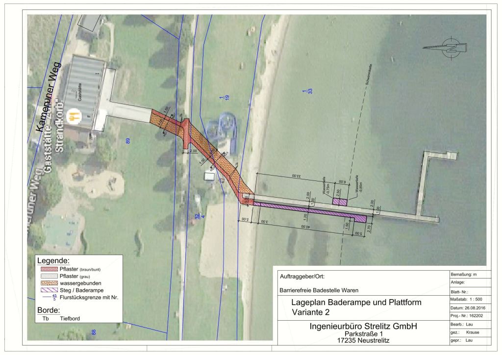 Warens Volksbad wird das erste barrierefreie Bad an der Müritz, die Bauarbeiten dafür sind inzwischen in vollem Gange. Der Weg zur Brücke hin ist bereits gepflastert. Der bestehende Badesteg wird auf der linken Seite um eine Plattform für einen mobilen Lift verbreitert, direkt neben dem Steg führt zudem eine Baderampe ins Wasser.