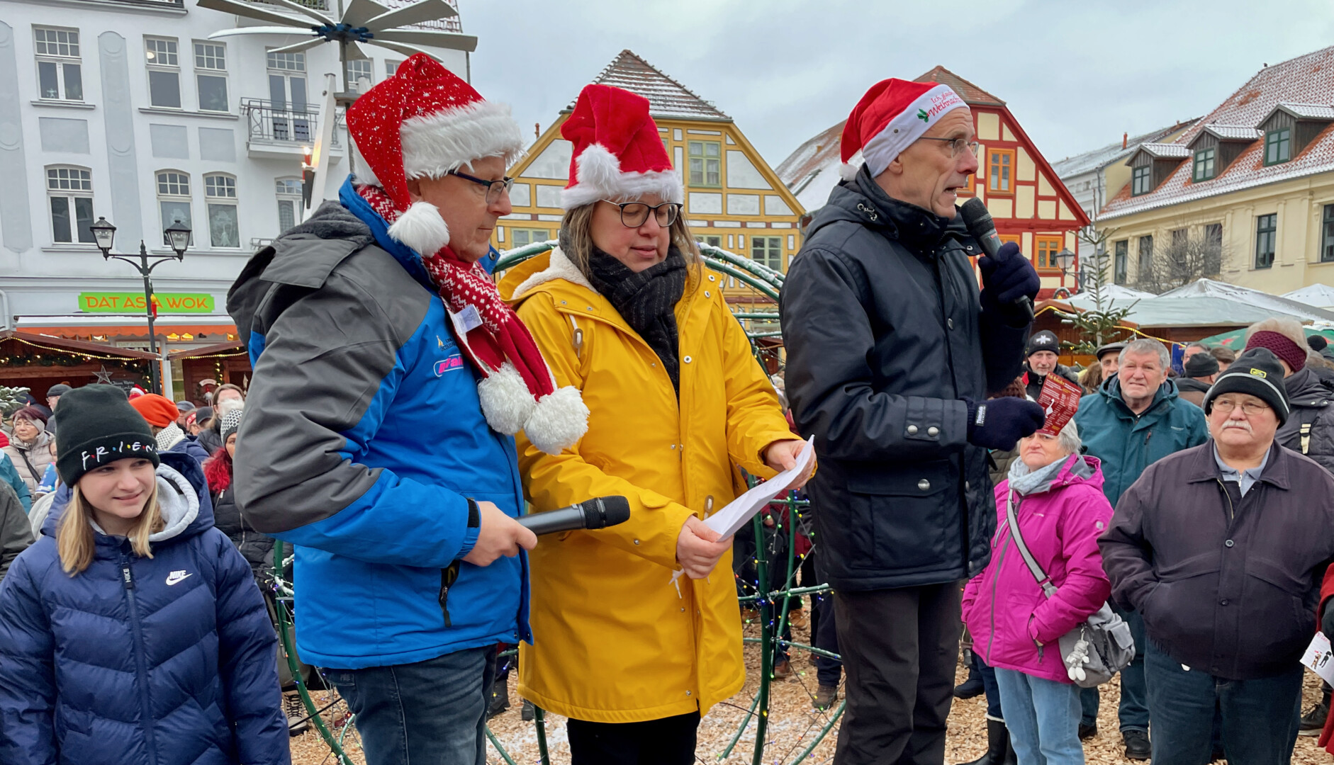 Wie nicht anders erwartet, war der Warener Weihnachtsmarkt zur heutigen Gänseverlosung proppevoll. Trotz der augenblicklich nicht so prickelnden wirtschaftlichen Situation ist es dem Innenstadtverein um Vorsitzende Claudia Bergmann wieder gelungen, Sponsoren für 100 Gänse zu finden. Mehr noch: 20 weitere gehen an wohltätige Einrichtungen wie das Warener Obdachlosenheim. Auch das hat schon Tradition. Und so brachten Bürgermeister Norbert Möller, Vereinschefin Claudia Bergmann sowie Olaf Gaulke heute Nachmittag zunächst die 100 Gänse an den Mann oder die Frau – in ihrer gewohnt lockeren Art. Dabei kam ihnen zugute, dass sie viele der Gewinner persönlich kannten, was das Ganze natürlich noch amüsanter machte. Unter anderem gewann mit Helga Fust auch die erste Chefin von Norbert Möller, was den Verwaltungschef ganz offenkundig richtig freute.