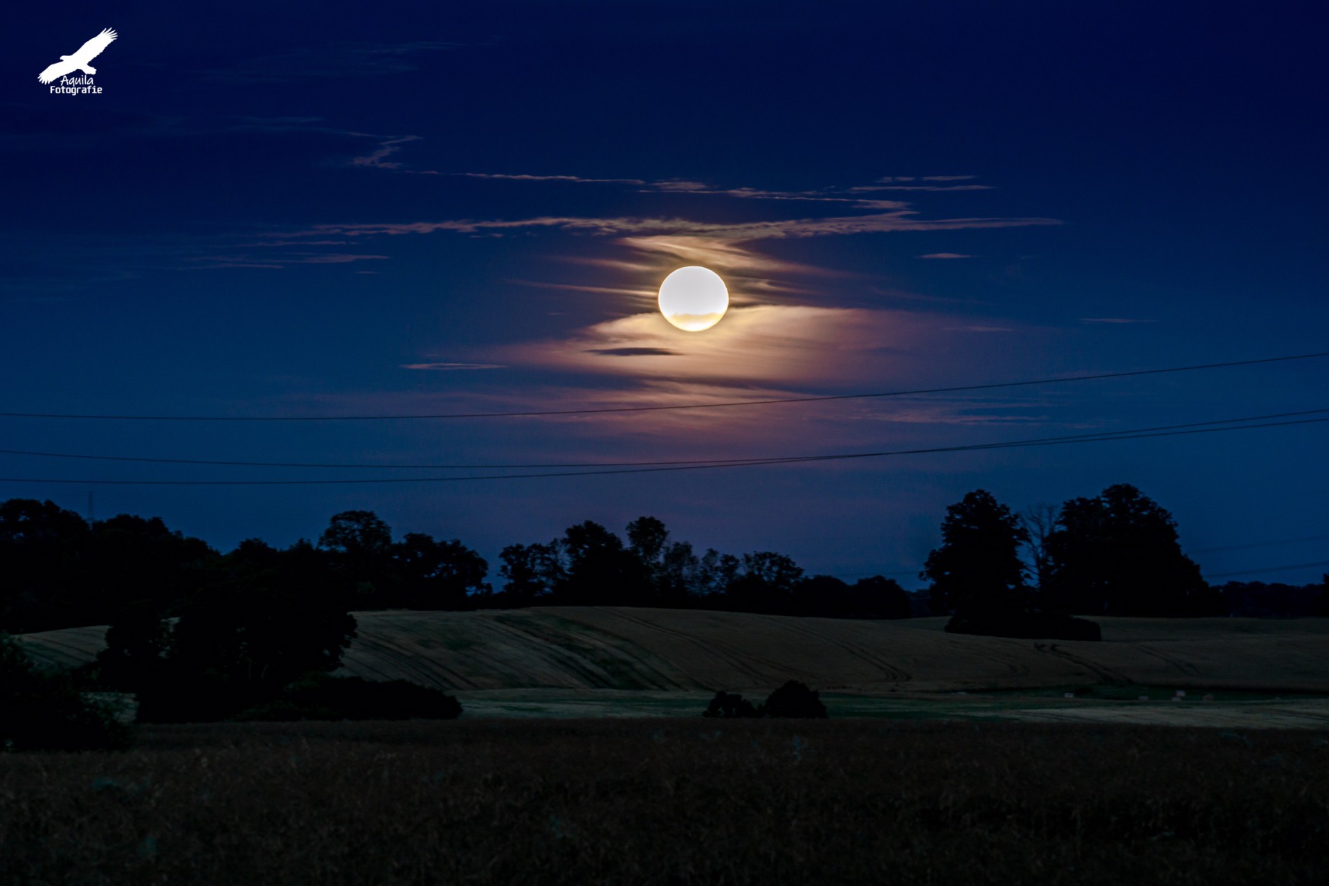 So hat sich der Vollmond gestern Abend bei Sophienhof präsentiert. Und zwar direkt nach dem Sonnenuntergang. Auf der einen Seite war der Himmel noch hell und auf der anderen ging der Mond bereits auf.