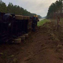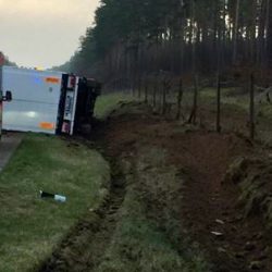 Der polnische Laster ist heute früh aus bislang nicht geklärter Ursache nach rechts von der Straße abgekommen und auf die Seite gekippt. Da er mehr als 20 Tonnen Papier geladen hat, zieht sich die Bergung in die Länge.