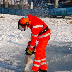 „Wir haben am Mittwoch schon mal geschnitten, da waren es 15 Zentimeter Eis“, sagt Felgner. Heute war wieder viel Kraft gefragt. An den von Schnee freigeräumten Stellen hatte sich schon wieder zehn Zentimeter dickes Eis gebildet.