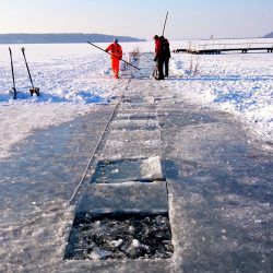 Die Eisbader haben sich am Steg sogar einen Eisschollenzaun gebaut. Auch an der Waldschenke, in Ecktannen, am Kietz und an der Feisneck-Badestelle haben Felgners Männer und Frauen ihre Eissäge-Spuren hinterlassen.