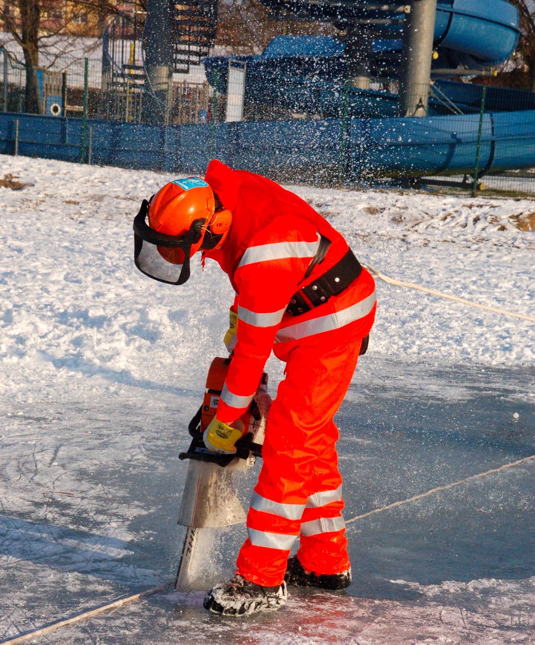 „Wir haben am Mittwoch schon mal geschnitten, da waren es 15 Zentimeter Eis“, sagt Felgner. Heute war wieder viel Kraft gefragt. An den von Schnee freigeräumten Stellen hatte sich schon wieder zehn Zentimeter dickes Eis gebildet.