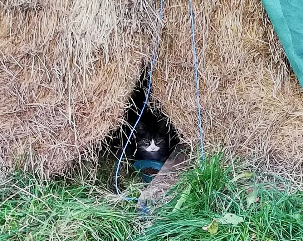 Die schlaue Katze hat es verstanden. Sie suchte sich einen optimalen Lebensort in den aufgetürmten Stroh-Futter-Ballen der Pferde, wenige Meter von der Box entfernt, und lässt sich seitdem wie im Fünf-Sterne-Hotel verwöhnen. Sie verlässt ihr sicheres Domizil, wenn das Futter-Signal kommt und draußen alles stimmt. Ein Sonnenbad hat es auch schon gegeben. Die 15 Pferde, 5 Katzen und zwei Hunde der Familie sind kein Problem. Die Hauskatzen haben aber sofort die zusätzliche Futterquelle in der Box entdeckt. Was ihnen am Strohhotel nicht gelingt, denn da sichert Kerstin Schäfer die Region ab – bis Nala gefressen hat.