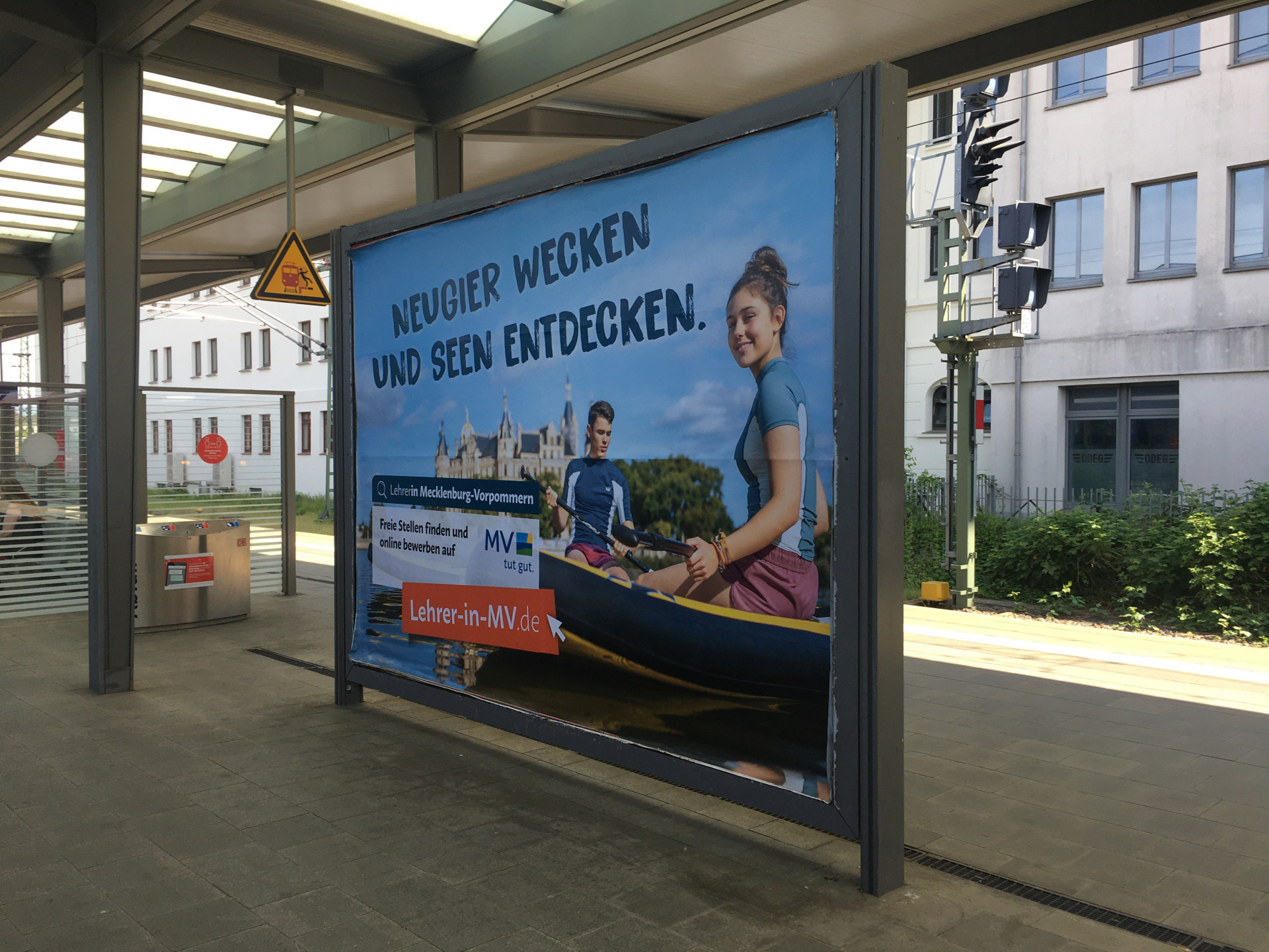 „Neugier wecken und Seen entdecken“ – mit diesem Slogan wirbt das Land zum Start der Tourismussaison auf Werbeflächen an wichtigen Verkehrskotenpunkten und Bahnhöfen in Mecklenburg-Vorpommern um Lehrkräfte. Seit 2016 ist der Start der Tourismussaison um das Pfingstwochenende ein Schwerpunkt der Werbekampagne.