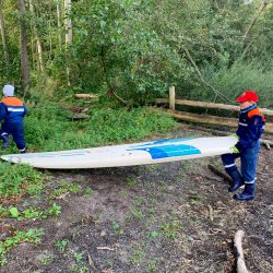 FDP-Mann Toralf Schnur fand mal eben eine Packung mit vier kleinen Kräuterschnäpschen – alle noch ungeöffnet und sicher auch gut gekühlt. Ach ja, auch ein Surfbrett zogen die eifrigen Helfer aus dem Gestrüpp. Das war aber offenbar kein Müll, sondern gehört anscheinend einem Anwohner der Fontanestraße, der sich einen Trampelpfad zur Müritz hergerichtet hat und dort sein Brettchen lagert. Gleich daneben ein Floß aus alten Paletten und großen Plastekanistern…