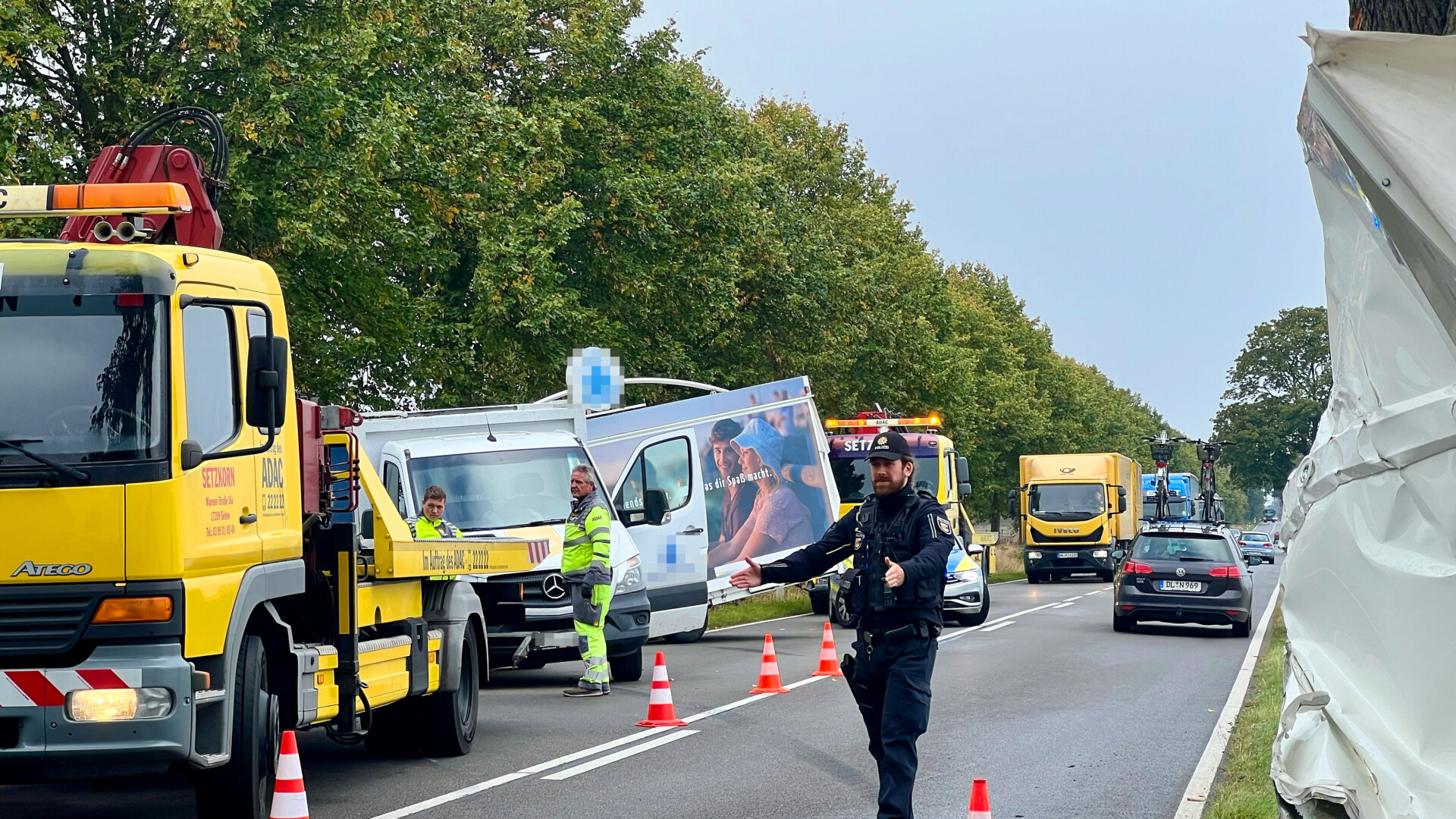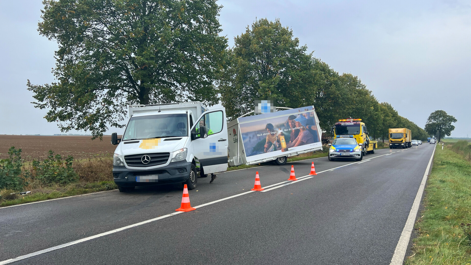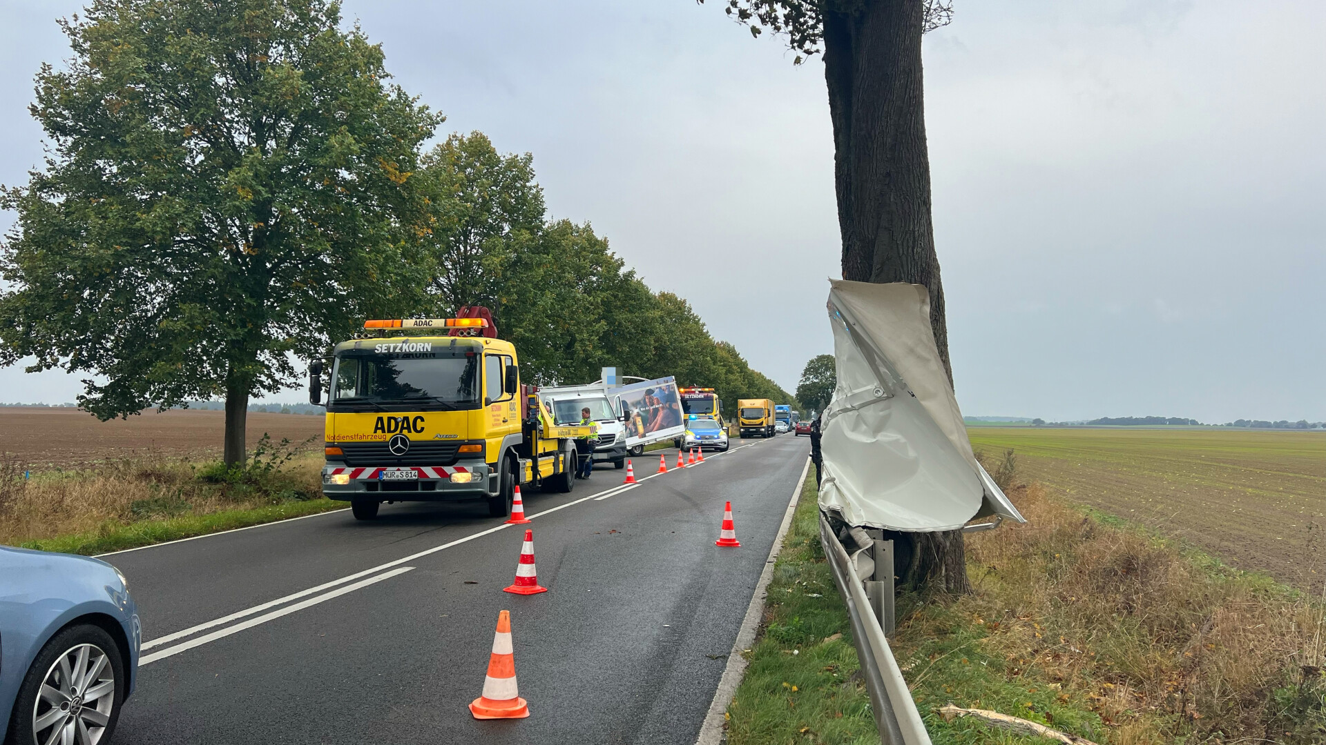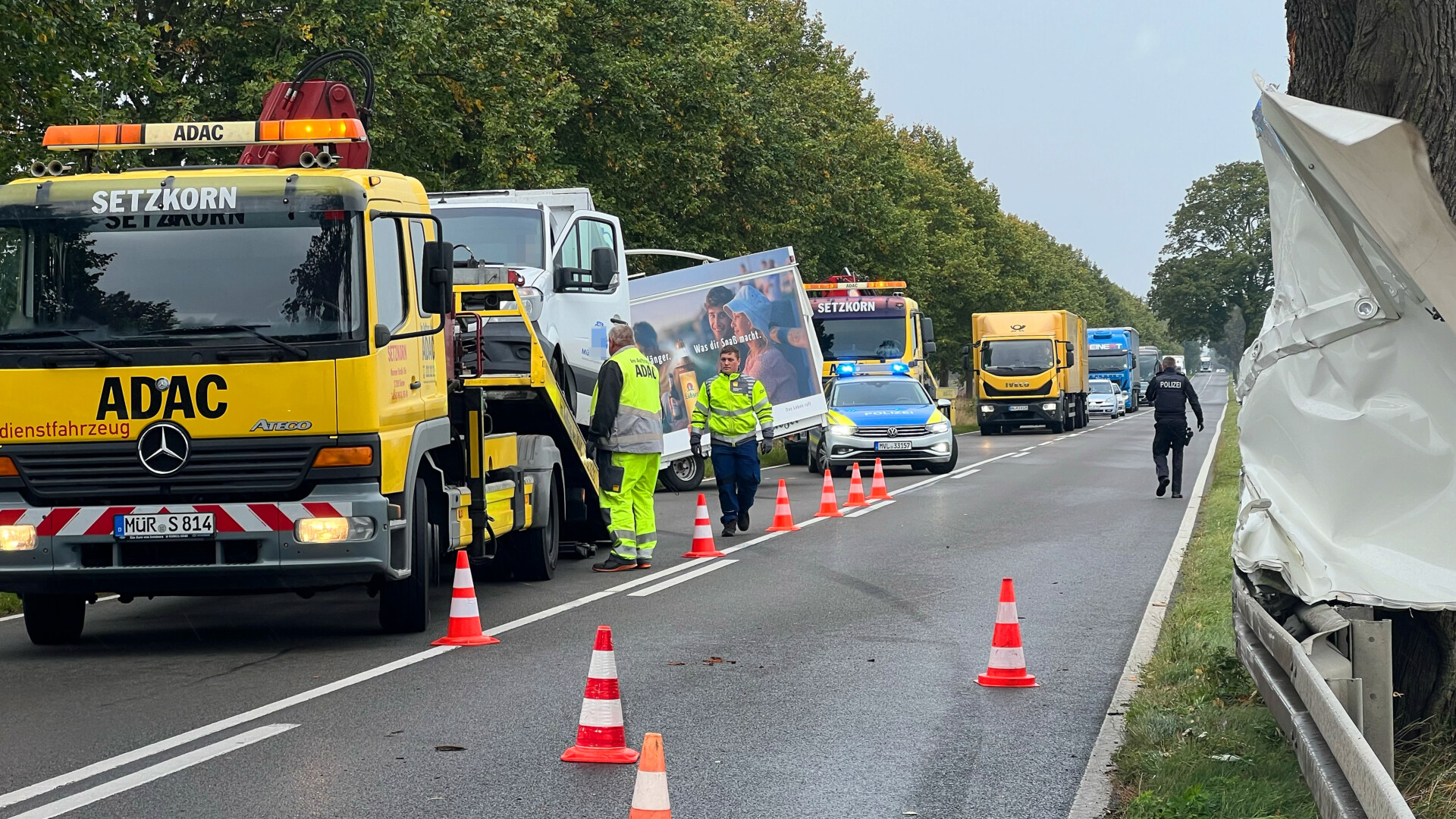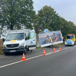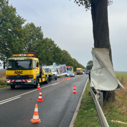 Richtig viel Glück hatte der Fahrer eines Transporters mit Anhänger heute Vormittag auf der Bundesstraße 198 bei Vipperow. Wie die Polizei vor Ort mitteilte, wurde das Gespann offenbar von einer Windböe erfasst und gegen einen Straßenbaum geschleudert. Das gesamte Gespann drehte sich daraufhin und schleuderte auf die Gegenfahrbahn. Der Bierwagen wurde seitlich aufgerissen und schwer beschädigt. Teile des Wagens blieben an dem Baum hängen. Für die Bergung musste die Bundesstraße in diesem Bereich für längere Zeit voll gesperrt werden. Verletzt wurde laut Polizeiangaben niemand.