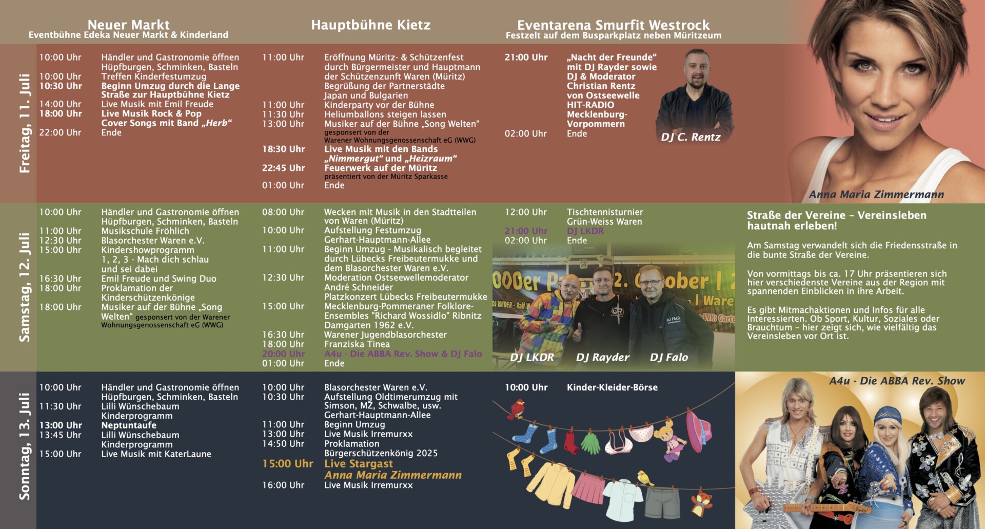 Nicht aus der Region, aber von vielen erwartet wird Sängerin Anna Maria Zimmermann, bekannt geworden durch „Deutschland sucht den Superstar“. Sie tritt am Sonntag ab 15 Uhr auf. Kurz vordem wollen die Organisatoren bekannt geben, wer den „Bollerwagen“ ein Jahr behalten darf. Damit wird das „Beste Bild“ im großen Umzug geehrt. Neu in diesem Jahr: Die Abstimmung läuft über die Homepage von „Wir sind Müritzer“, Flatter-Zettel sind passé. Ab 11 Uhr wird auf der Homepage eine Abstimmungsseite freigeschaltet. Entweder, man geht direkt auf die Seite oder nutzt den QR-Code, der unter anderem auf einem großen Banner am Müritzeum zu sehen ist. Jeder, der mit auswählt, hat drei Stimmen, von jeder IP-Adresse aus kann nur einmal abgestimmt werden. Zwischenergebnisse werden nicht angezeigt. Und – niemand muss sich beeilen, die Abstimmung läuft von 11 bis 18 Uhr. Also genug Zeit, nach dem Umzug gemeinsam mit Freunden zu überlegen und sich noch ein bisschen auf dem Fest zu amüsieren.