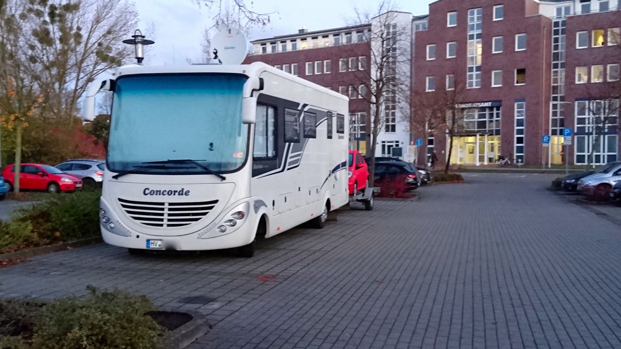 So einfach geht’s am Brückentag: Warum eigentlich auf dem nur wenige Meter etfernten Caravan-Parkplatz parken? Dieses Fahrzeug aus Havelberg in Sachsen-Anhalt blockierte heute mal eben acht Stellplätze auf dem einzigen kostenfreien Parkplatz am Warener Amtsbrink, der von vielen Frauen und Männern genutzt wird, die in der City arbeiten. Die Sat-Schüssel war noch aufgestellt, die Jalousien zum Schlafen heruntergelassen.