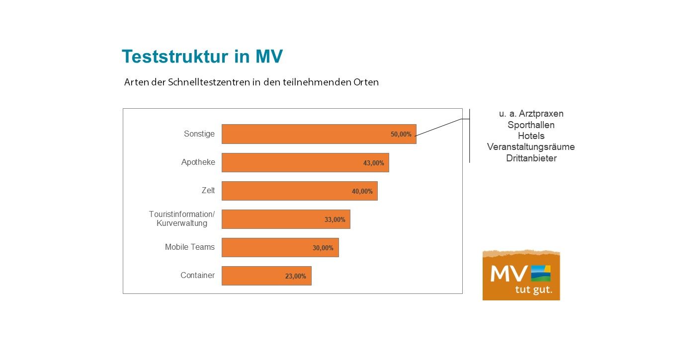 Ergänzt werden die öffentlich eingerichteten Testzentren von Dienstleistern, die ebenfalls Schnelltests und mittlerweile auch begleitete Selbsttests anbieten und nachweisen können. In der jüngsten Branchenumfrage des Tourismusverbandes MV hatten 36 Prozent der befragten touristischen Unternehmen angegeben, dass sie ihren Gästen Tests ermöglichen wollen.