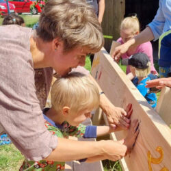 Mit Hilfe der Eltern gestalteten sie eine Bank mit ihren Handabdrücken. Diese Bank hat einen schönen Platz bekommen und wird die Erzieherinnen jetzt immer an die Mädchen und Jungen erinnern.