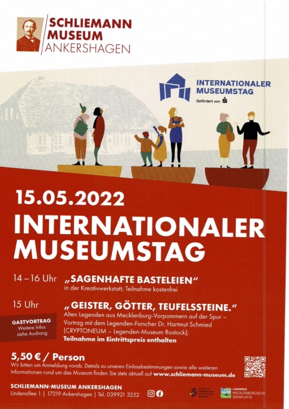 Anlässlich des Internationalen Museumstages am kommenden Sonntag, 15. Mai, gibt es im Heinrich-Schliemann-Museum in Ankershagen einen Gastvortrag des Legenden-Forschers Dr. Hartmut Schmied (CRYPTONEUM – Legenden-Museum Rostock) zu „Geister, Götter, Teufelssteine – Alte Legenden aus Mecklenburg-Vorpommern auf der Spur“.