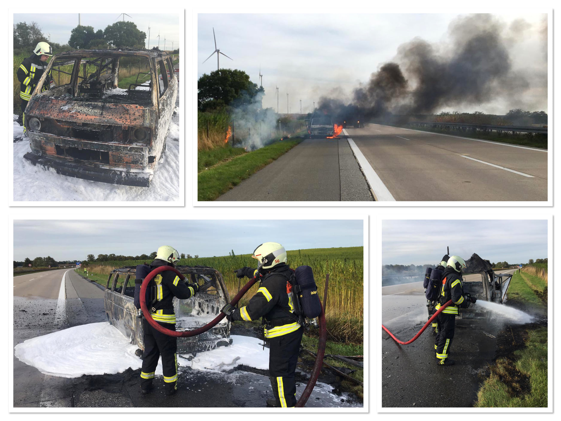 Auf der Autobahn 19 in Fahrtrichtung Rostock ist heute Nachmittag ein VW T3 vollständig ausgebrannt. Die beiden Insassen aus Berlin konnten sich unverletzt aus dem brennenden Fahrzeug befreien und alarmierten die Rettungskräfte. Das Fahrzeug brannte rund zwei Kilometer vor der Abfahrt Röbel. Im Einsatz waren die Kameraden der Freiwilligen Feuerwehr Wittstock.