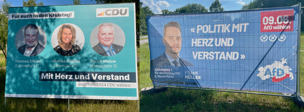 Ups! Sind die CDU und die AFD der Seenplatte etwa Kunden der selben PR-Agentur, die sich diese „originellen“ Slogans ausgedacht hat? Oder gibt’s einfach zu wenig knackige Sätze, die man auf Wahlplakate drucken kann? Beide Parteien haben jedenfalls ganz viel Herz und noch mehr Verstand, oder so. Aber wir sind uns ziemlich sicher, dass nicht ein einziger Wähler anhand von irgendwelchen Plakaten entscheidet, wo er sein Kreuz am 9. Juni setzt. Insofern ist es ja eigentlich auch egal, was da drauf steht.