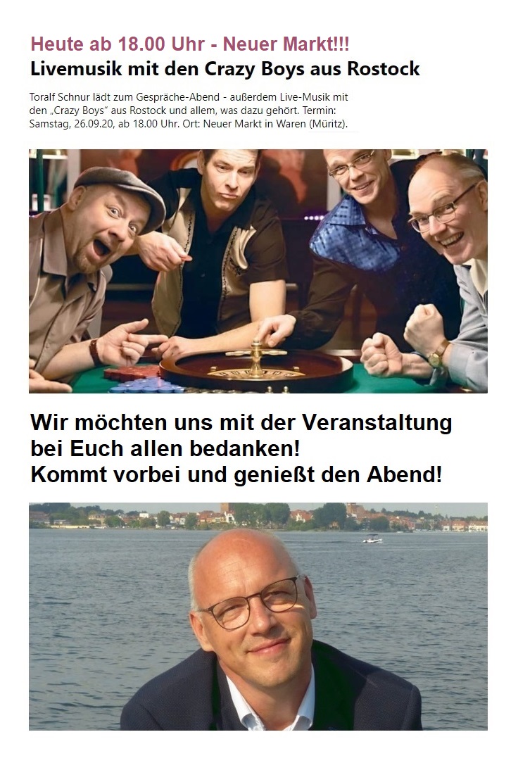 Noch sieht das Wetter nicht so toll aus, aber am Abend wird’s hoffentlich besser. Wie auch immer. Wir wollen heute Abend nach einem anstrengenden Wahlkampf Spaß mit Euch haben: