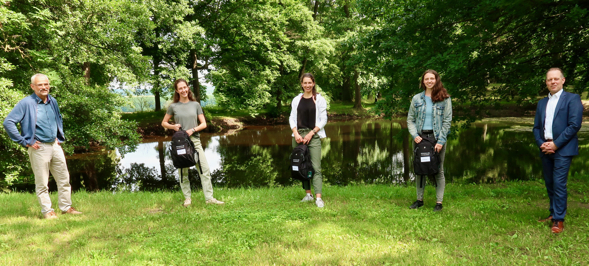 Bild oben: Ulrich Meßner, Leiter des Nationalparkamts, die Praktikantinnen Emily Mc Cracken, Alicia Riepe und Viktoria Maurer mit Filialdirektor Knut Heineken (v.l.) bei der Rucksackübergabe.