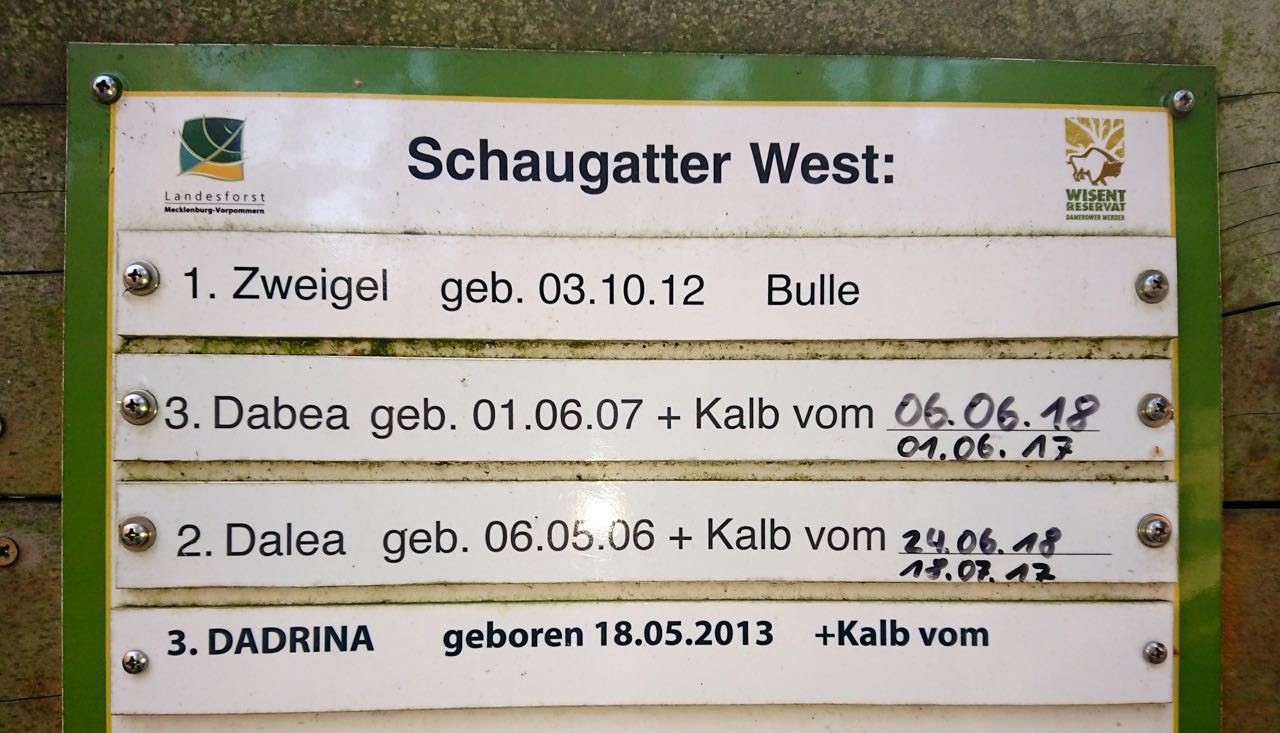 Die beiden Bullen „Zweigel“ und „Dahn“ beäugen misstrauisch die Besucher, die ihrerseit andersherum neugierig nach Kälbern Ausschau halten. Gleich vier wurden in den beiden Schaugattern geboren, steht an den Tafeln. Doch weiter hinten, wo die größte Herde weitgehend frei und für Besucher unsichtbar auf der Halbinsel umherstreift, gab es 2018 gar keinen Nachwuchs, erläutert Wisent-Förster Fred Zentner. Deshalb bekommen die Wisent-Freunde jetzt Hilfe aus Rostock.