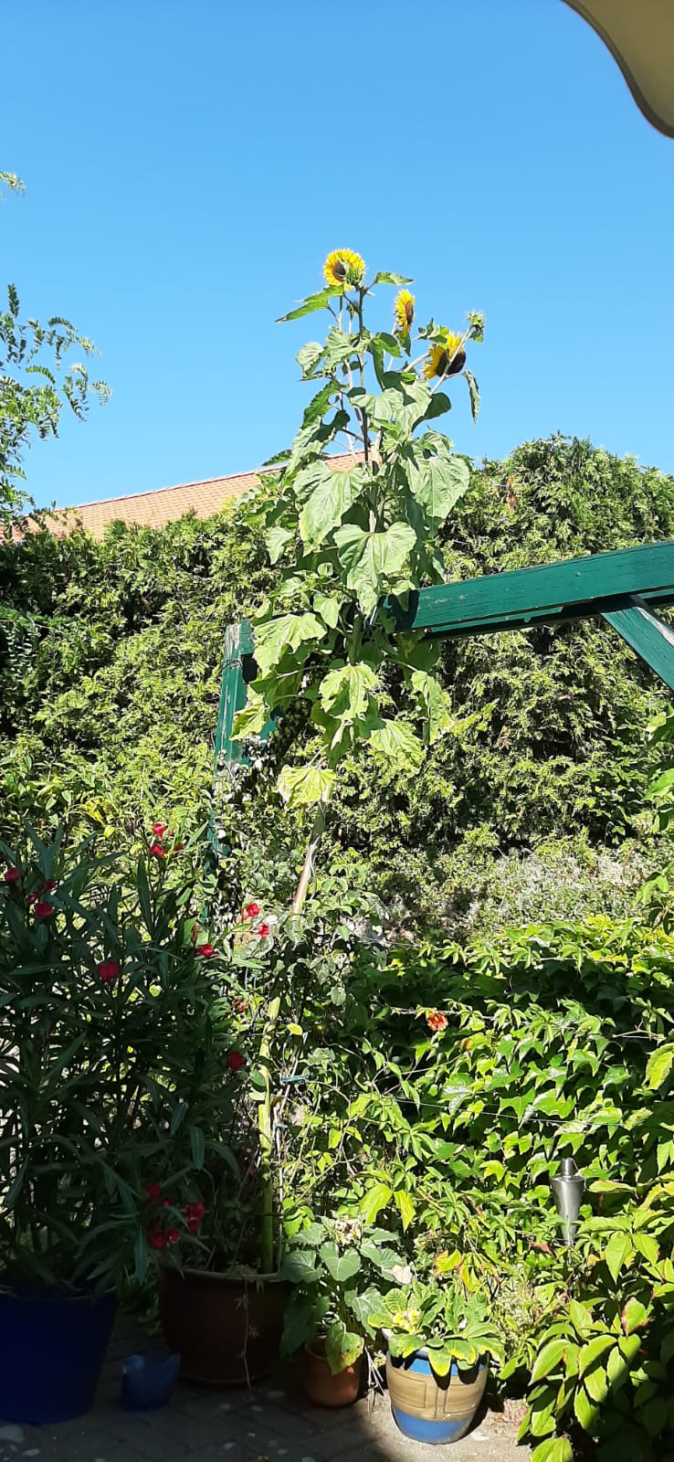 Und auch wenn die Rosen bereits verblüht sind – die Sonnenblume strahlt mit der Sonne um die Wette. Damit das so bleibt, bekommt sie momentan dreimal am Tag Wasser.