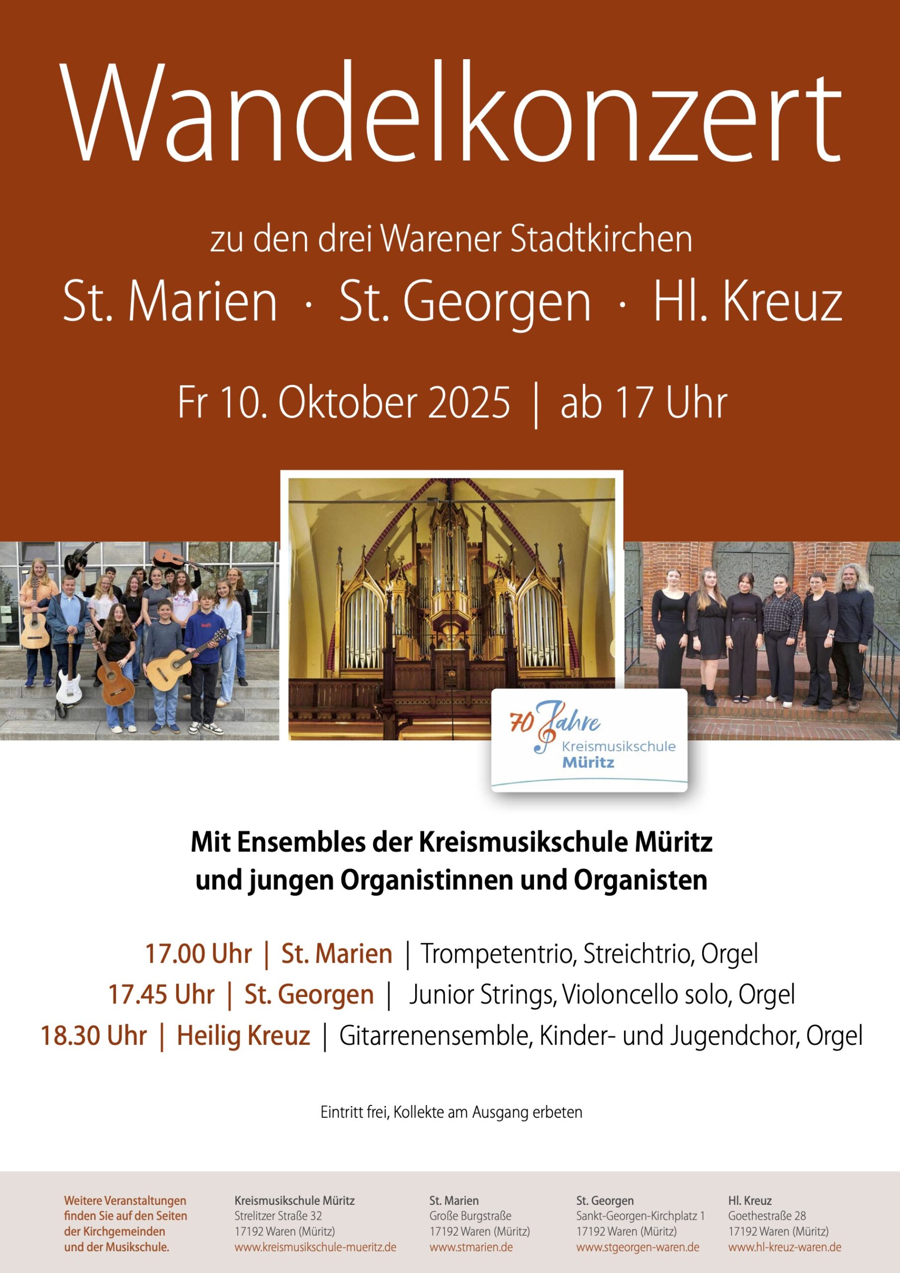 „Wandelkonzert“ heißt es am kommenden Freitag, 10. Oktober, ab 17 Uhr in Waren. Dabei wollen Kinder und Jugendliche die drei Warener Stadtkirchen wieder mit viel Musik und Leben füllen. Vorbereitet haben sich Ensembles der Kreismusikschule Müritz und Orgelschüler der Müritz-Region. Um 17 Uhr ist Start in St. Marien. Weiter geht es um 17.45 Uhr in St. Georgen und zur letzten Etappe um 18.30 Uhr in die Katholische Hl. Kreuz-Kirche. in der Goethestraße. Der Eintritt ist frei,Spenden für den Förderverein der Kreismusikschule Müritz und die Organisten-Ausbildung in der Kirchenregion Müritz sind willkommen.