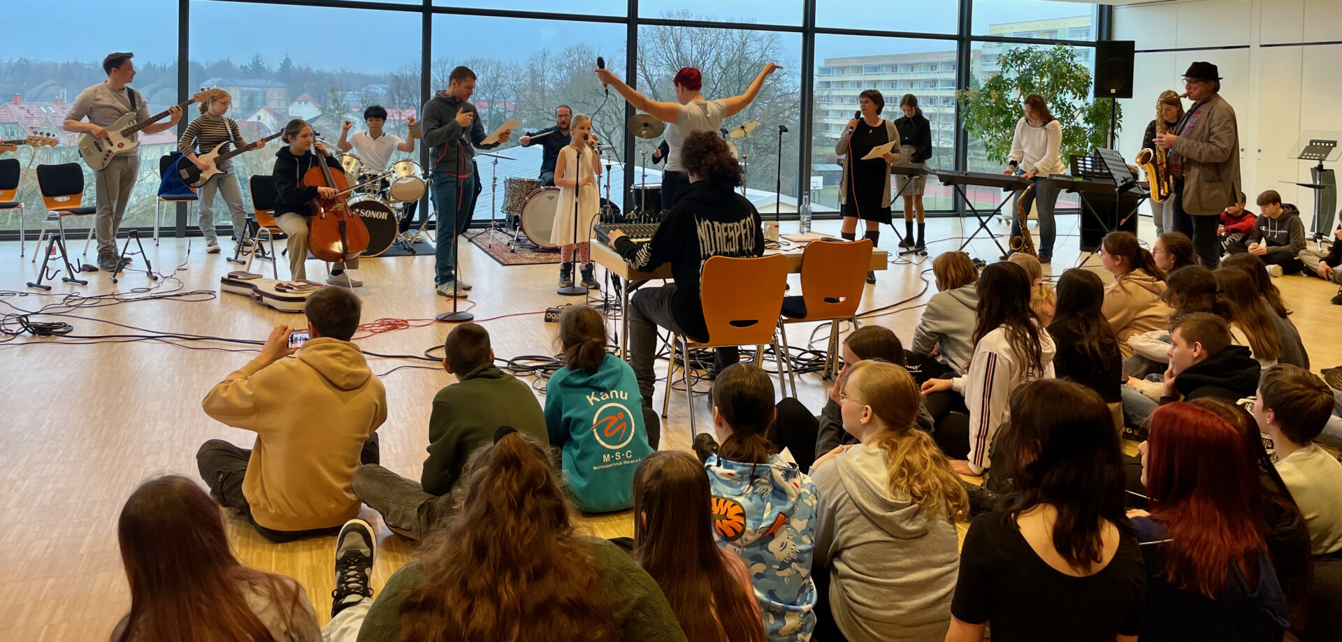 Startschuss an der Friedrich-Dethloff-Schule in Waren für das Projekt „48 Könige“. Das Ziel ist es, Menschen mit Hilfe von Musik zusammenzuführen. Die Veranstaltung vor wenigen Tagen lockte zahlreiche Teilnehmer an, darunter Schüler, Schulleiterin Martina Hagendahl (Schulleiterin) und Martina Schmidt (Kurzentrum Waren), sowie Unternehmer wie Ingo Warnke und Christian Holz. Zur Unterstützung der Auftaktveranstaltung holte sich Initiatorin Sandra Weckert lokale Musiker ins Boot, darunter Mark Rose am Schlagzeug, Stefan Rogalski am Bass und Matthias Hübner an der Gitarre.