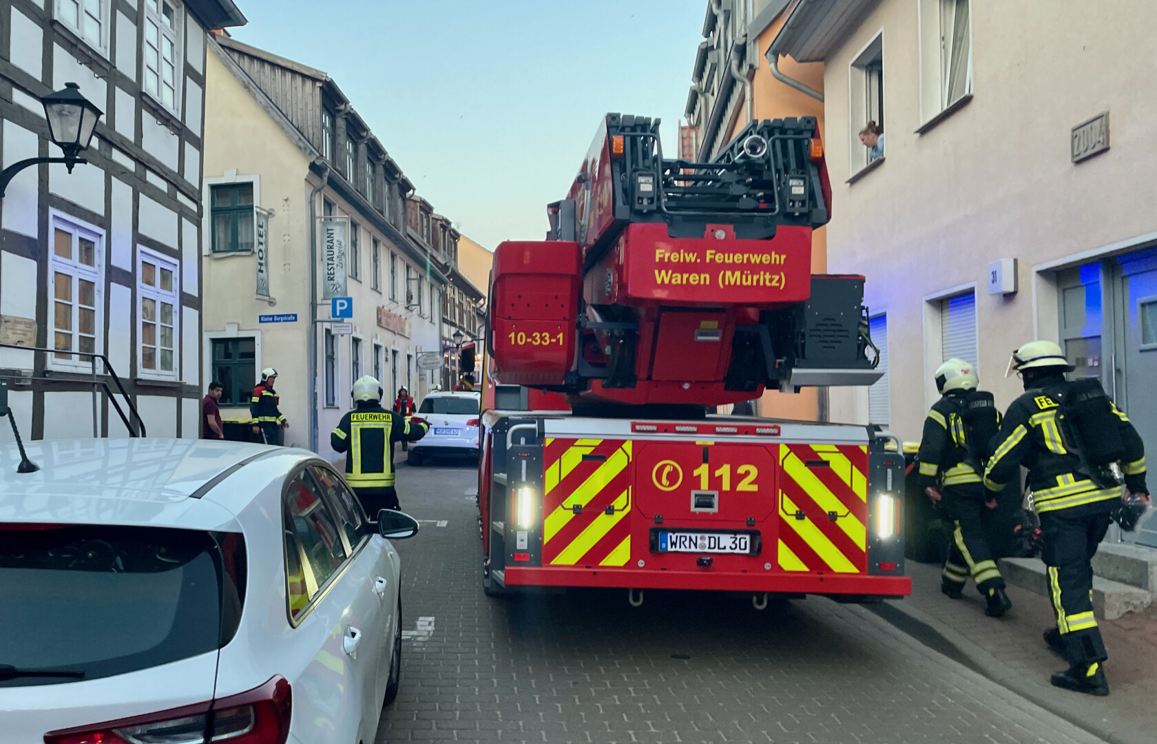 Warens Feuerwehr war mit mehreren Einsatzwagen vor Ort, außerdem der Rettungsdienst und die Polizei. Auch ein Mitarbeiter der Stadtwerke kam zum Einsatzort und führte eine Gasmessung durch.