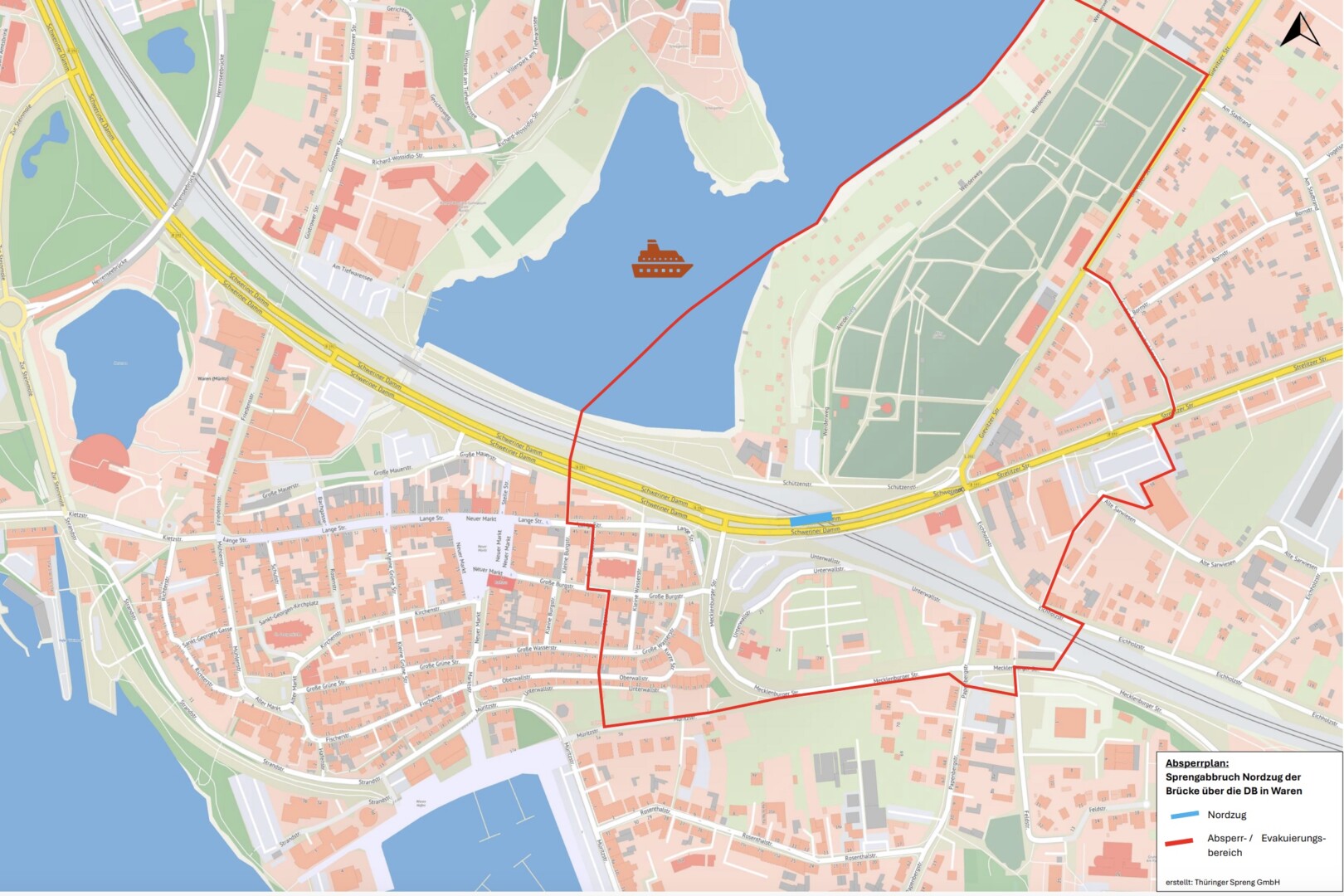 Um eine sichere Sprengung zu gewährleisten, muss am Sonntag, 19. Januar, der Bereich im Umkreis der Brücke im Interesse der größtmöglichen Sicherheit aller Beteiligten vollständig evakuiert werden. Der Verlauf der Sperrzone ist im Absperrplan (siehe unten) eingezeichnet. Grenzen sind unter anderem die Straßen St. Mariengasse, Burggasse, Müritzstraße, Mecklenburger Straße, Alte Sarwiesen, An den Schuhmacherkämpen, Gievitzer Straße sowie einen Teil des Tiefwarensees. Der Evakuierungsbereich gilt auch für die Gärten am Tiefwarensee. Der Neue Friedhof ist ganztägig geschlossen.