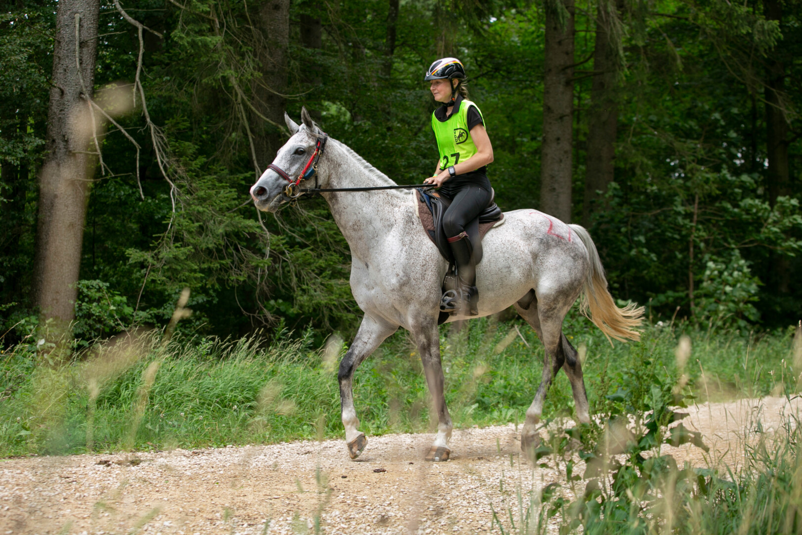 Clara und ihr Pferd trotzten nicht nur den stürmischen Gewitterschauern, sondern bewältigten auch 2057 Höhenmeter. Der Ritt gilt als technisch anspruchsvoll, die Wege sind durchweg schottrig-hart, die wenigen Wiesenabschnitte durch Regenschauer dagegen glitschig-glatt.