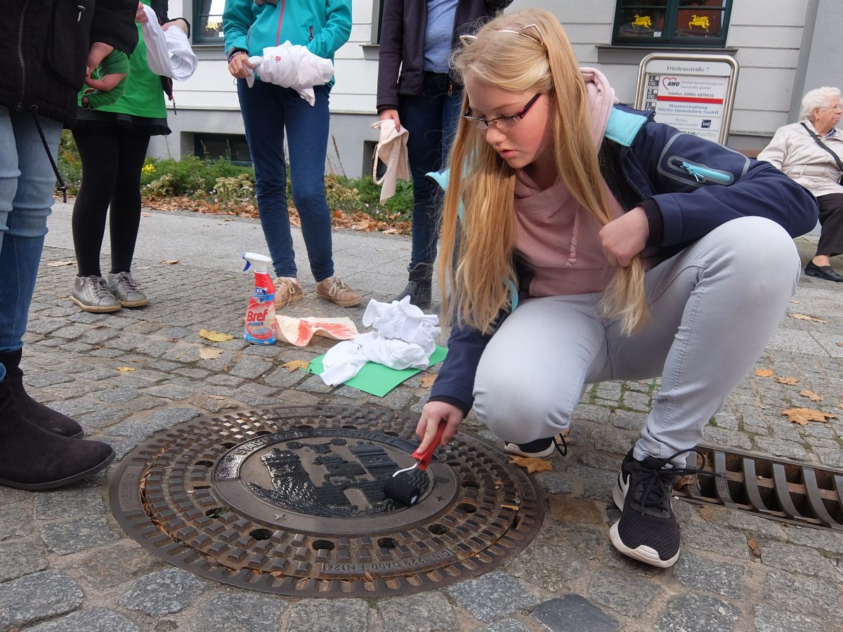 Da haben sich viele Passanten verdutzt die Augen gerieben: Vor wenigen Tagen stürzten sich Mädchen und Jungen der Arche-Schule auf die Gullys und Regeneinlässe in der Warener Innenstadt.
