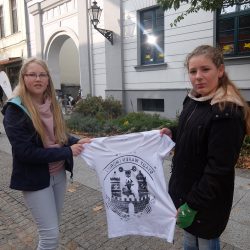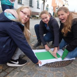 „Die Stadt mit anderen Augen sehen und erfahren und ins Auge des Betrachters rücken. Das war das Ziel des ‚Urban Street Art Project‘ des Kunstunterrichts der Klasse 6 der Arche Schule. Die Schüler sollten ihre Stadt unterhalb der normalen Sehhöhe wahrnehmen und dann mit Hilfe verschiedener Drucktechniken in Sehhöhe bringen. Dafür eignete sich zum Beispiel der T-Shirtdruck“, erklärte Lehrer Sten Schmidt.
