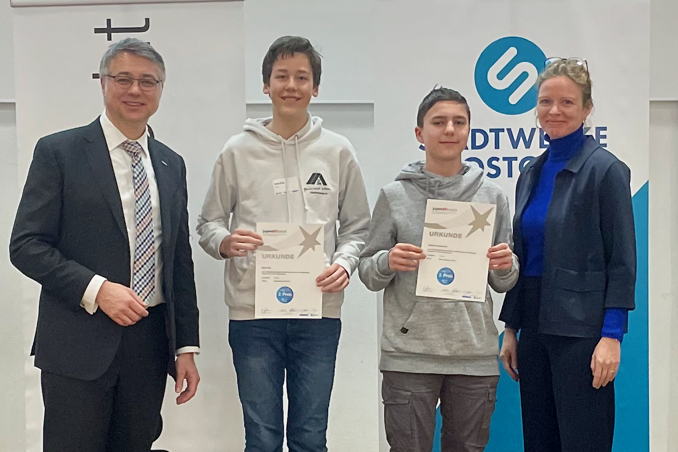 In der Kategorie Technik belegten Enno Ecks und Malthe Kretschmann mit dem Projekt „Zebrastreifensicherheit“ ebenfalls einen 2. Platz (Foto unten von links).