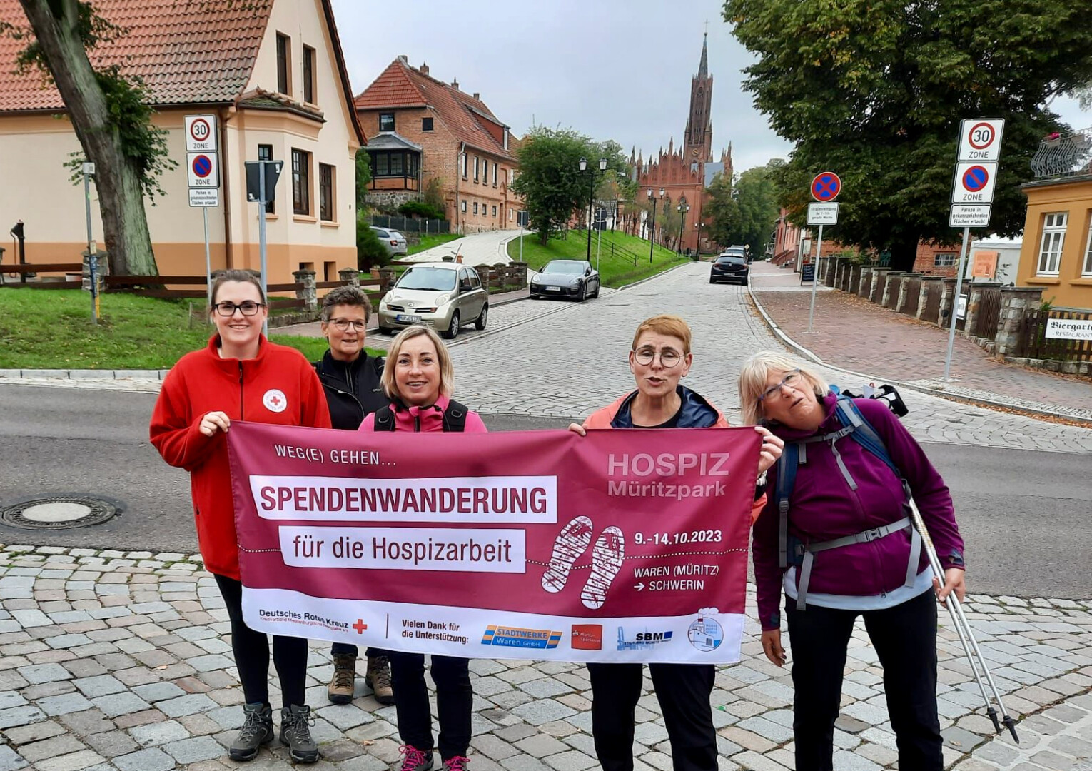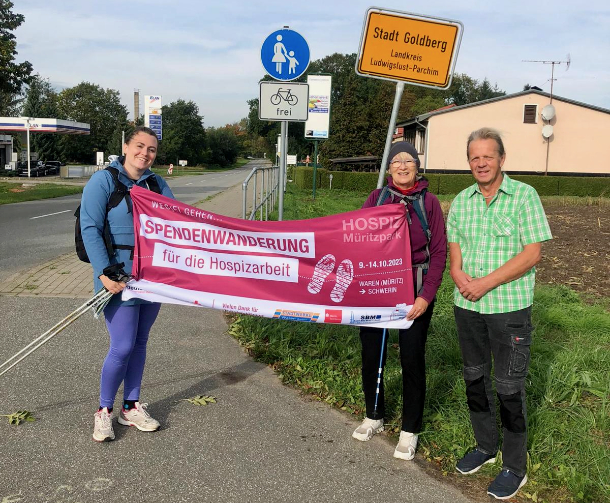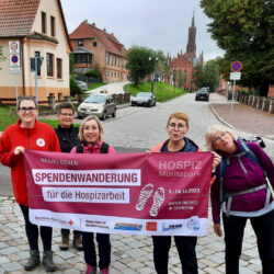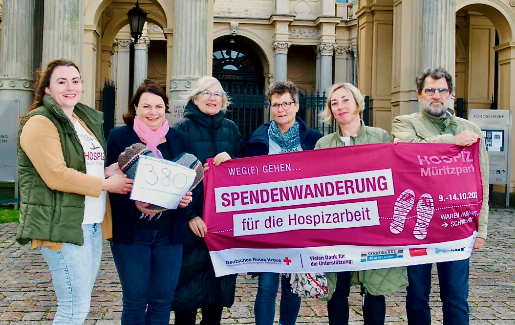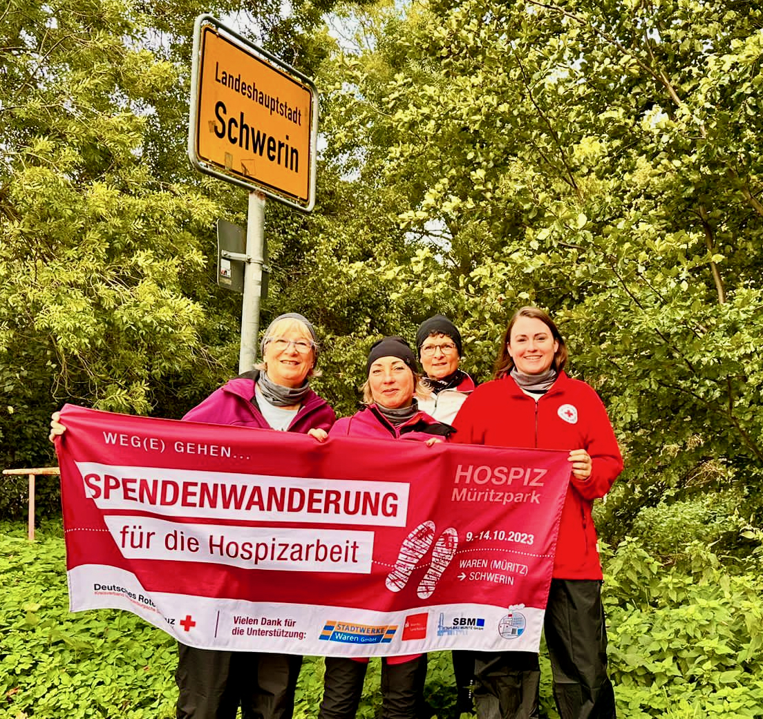 Sie haben es geschafft! Nicht ganz so wie geplant, aber nach fünf Tagen wanderten die Warener Hospiz-Damen in Schwerin ein. Von Montag an waren sie von Waren aus unterwegs, um vor allem auf das wichtige Thema Hospizarbeit aufmerksam zu machen, aber auch, um Spenden zu sammeln. Geld, um unter anderem letzte Wünsche von den Gästen des Warener Hospizes erfüllen zu können. Mehr als 4000 Euro kamen bisher zusammen, das Spendenkonto ist aber noch einige Tage geöffnet. „Wir hatten unterwegs wirklich ganz tolle Begegnungen, Menschen, die sehr viel über unsere Arbeit wissen wollten, Frauen und Männer, die spontan gespendet haben, und jede Menge Autofahrer, die uns durch Hupen und Winken motiviert haben“, berichtet Katharina Wennmann-Schröder, Mitarbeiter im DRK-Hospiz „Müritzpark“ und diejenige, die auf die Idee gekommen ist, mit der Wanderung für die Hospizarbeit zu werben.