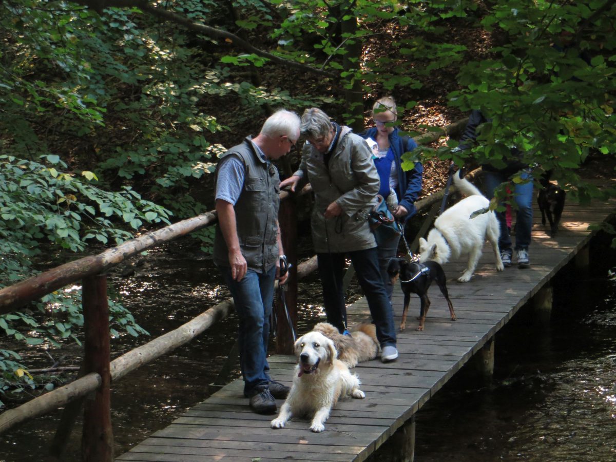 Der Rückweg führte am Standort des ehemaligen Schlosses Kuchelmiß vorbei. Zum Abschluß der Wanderung wurden die Hunde vor die Aufgabe gestellt, entweder ein Wasserhindernis zu durchqueren oder den Weg über eine nahe Brücke zu wählen, um zu ihren Menschen zu kommen. Jeder Hund löste diese Aufgabe auf die von ihm bevorzugte Weise schwimmend oder trockenen Fußes.