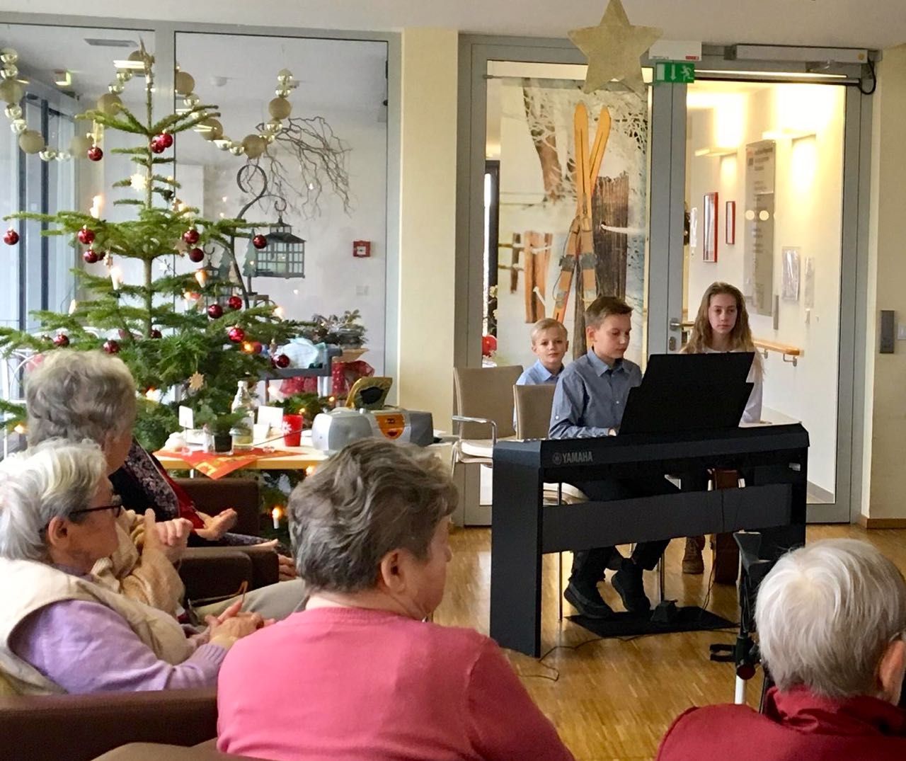 Weihnachten ist Freude schenken und Freude empfangen. Seit einigen Jahren besuchen die Schüler Ida und Jonathan am Heiligabend die lieben Bewohner des AWO Pflegeheimes am Tiefwarensee. Sie spielen für sie Weihnachtslieder auf der Gitarre und dem Klavier und freuen sich, wenn die Senioren mitsingen und summend einstimmen. In diesem Jahr spielte auch Zweitklässler Mattheo sein erstes Stück vor.