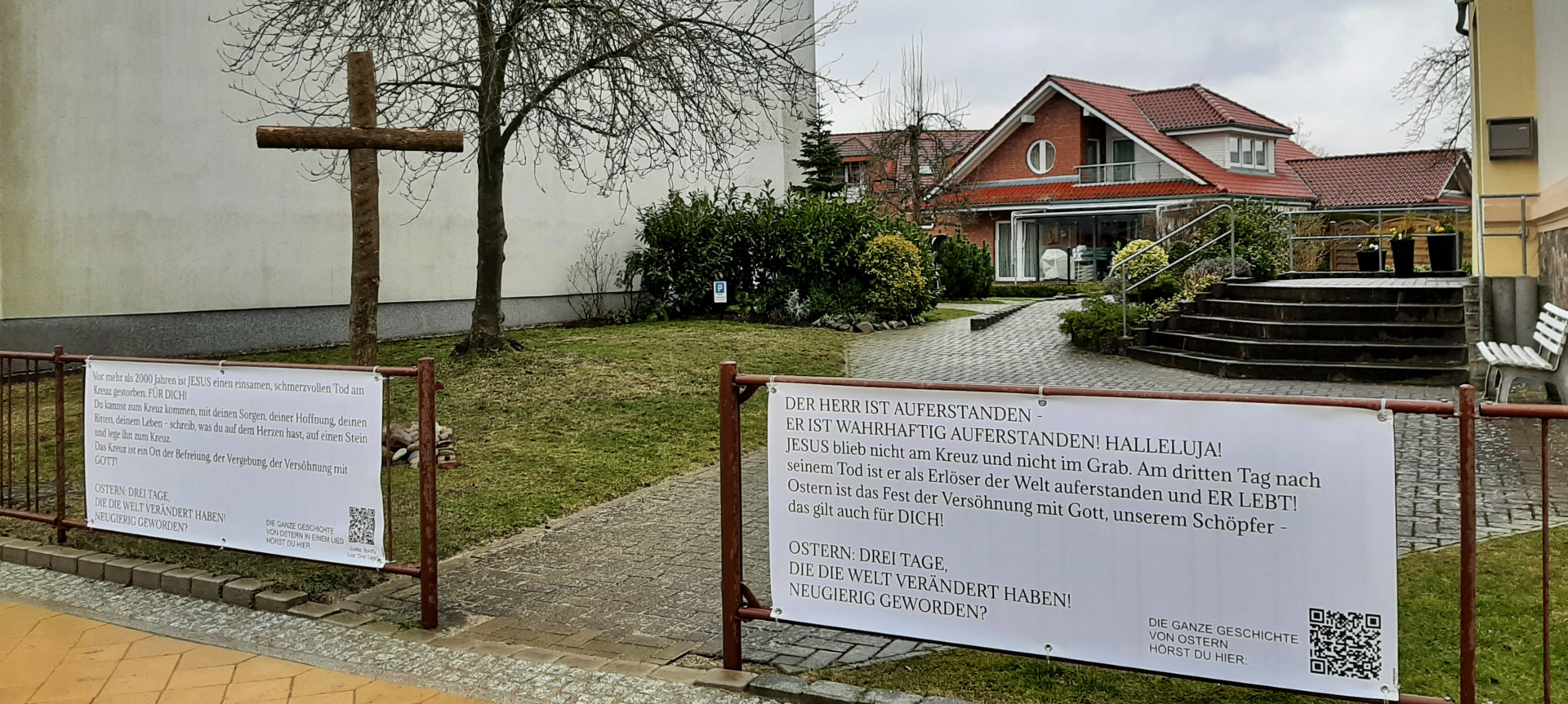 Die Evangelisch-Freikirchlichen Gemeinde lädt in den Tagen vor Ostern und bis zum Ostermontag zum Innehalten ein. Passanten, die an dem Gemeindehaus in der Goethestraße 32 in Waren vorbeigehen, werden auf die Osterbotschaft aufmerksam gemacht. Durch Banner am Zaun werden der Tod Jesu und seine Auferstehung thematisiert. Mittels QR-Codes sind ein Osterlied und die gelesene Ostergeschichte übers Smartphone hörbar. Vor der Gemeinde wurde ein Kreuz aufgestellt, Steine und Stifte liegen bereit. Sorgen, Wünsche und Gedanken können als beschriftete Steine unter das Kreuz gelegt werden.