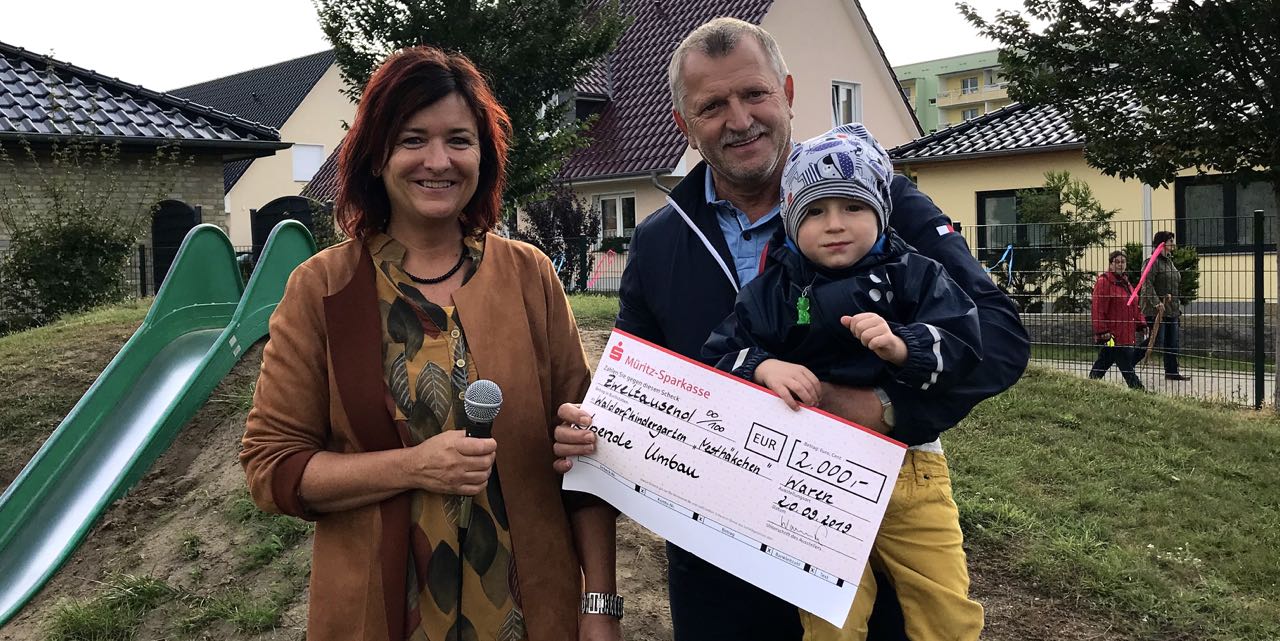 Der Warener Unternehmer Ingo Warnke kam zum Erntefest, und zwar nicht mit leeren Händen. Getreu seinem Motto „Jeden Tag eine gute Tat“ brachte er einen Spendenscheck mit: So konnten sich Renate Winter und ihr Team über 2000 Euro freuen.