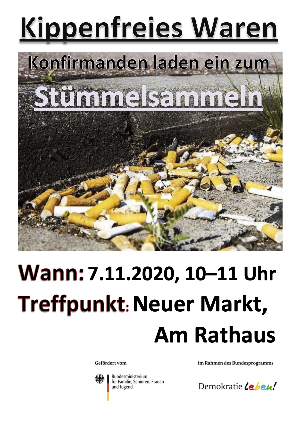 Am 7. November rufen die Konfirmanden der Stadt Waren zu einer besonderen Aktion auf. Es geht um Kippen. Um die Kippen, die auf den Straßen, Plätzen, auf Spielplätzen, am Strand und in Blumenrabatten liegen. Denn Kippen sind giftig. Und schön sehen sie natürlich auch nicht aus. Deshalb laden die Konfirmanden am kommenden Sonnabend zum Kippensammeln ein. Sie wollen einen kippenfreies Waren.
