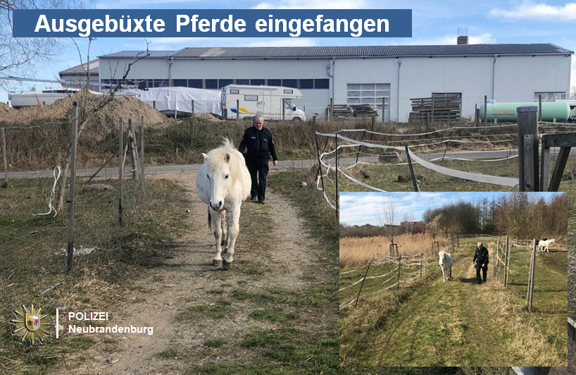 Warens Polizisten sozusagen als Cowboys: Zwei ausgebüxte Ponys haben heute die Beamten in Waren auf den Plan gerufen. Bei bestem Sonnenschein spazierten sie in der Otto-Intze-Straße in Waren umher, bevor die Beamten sie einfangen und wieder zurück auf die Koppel treiben konnten.