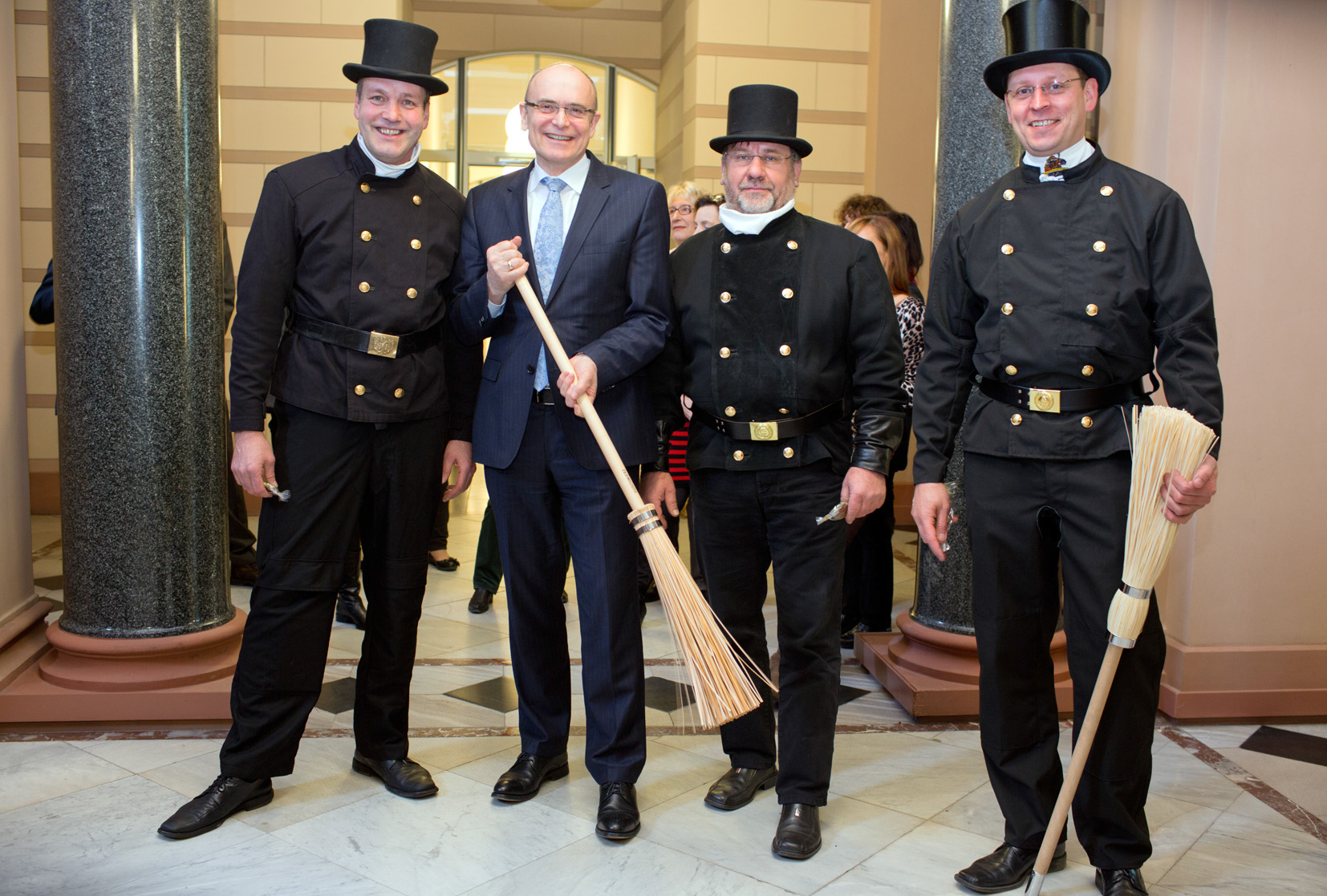 Sie überreichten dem Ministerpräsidenten einen Glücksbringer aus Metall, einen Kehrbesen sowie einen Schornsteinfeger-Kalender 2014. Der Ministerpräsident gab die guten Wünsche für das neue Jahr zurück und übergab den Handwerkern in Schwarz vierblättrige Kleeblätter aus Schokolade.