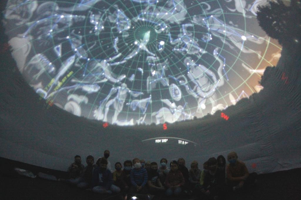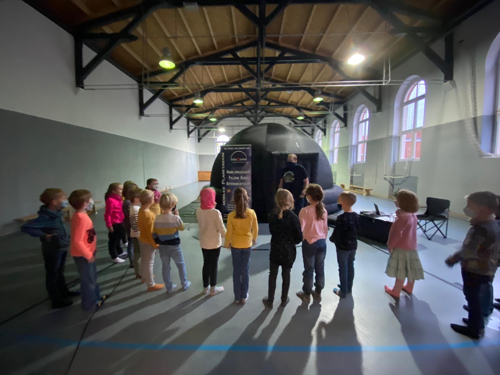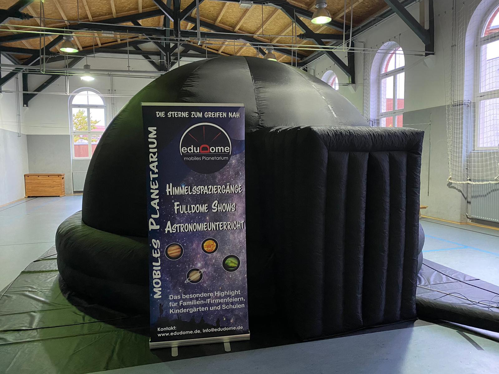 Unter die fünf Meter breite, aufblasbare Kuppel passten ca. 20 Kinder, die bequem auf Kissen saßen oder auf dem Rücken lagen und einen virtuellen Weltraumspaziergang unternahmen. Sie fuhren mit einem Raumschiff durch das Sonnensystem und lernten spielerisch die Planeten und Sternbilder kennen. Dabei erlebten Sie einige Abenteuer, zum Beispiel die Landung auf dem Mond und den Flug durch einen Asteroidenschauer. Im Vorfeld dazu konnten dazu Sternenschablonen gebastelt werden. Nach der etwa einstündigen Reise waren alle Kinder von den Sternen total fasziniert. „Das fühlte sich an wie im echten Raumschiff“ schwärmte ein Drittklässler kurz danach.